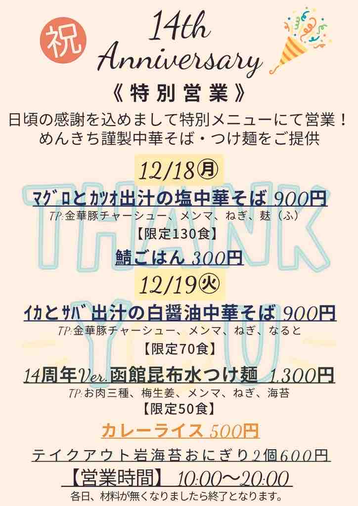 年末年始は休まず営業しているそうで 3日間で区切って限定メニューも提供されるそうなので 年越し、年始のラーメンは めんきちさんにキマりかも!