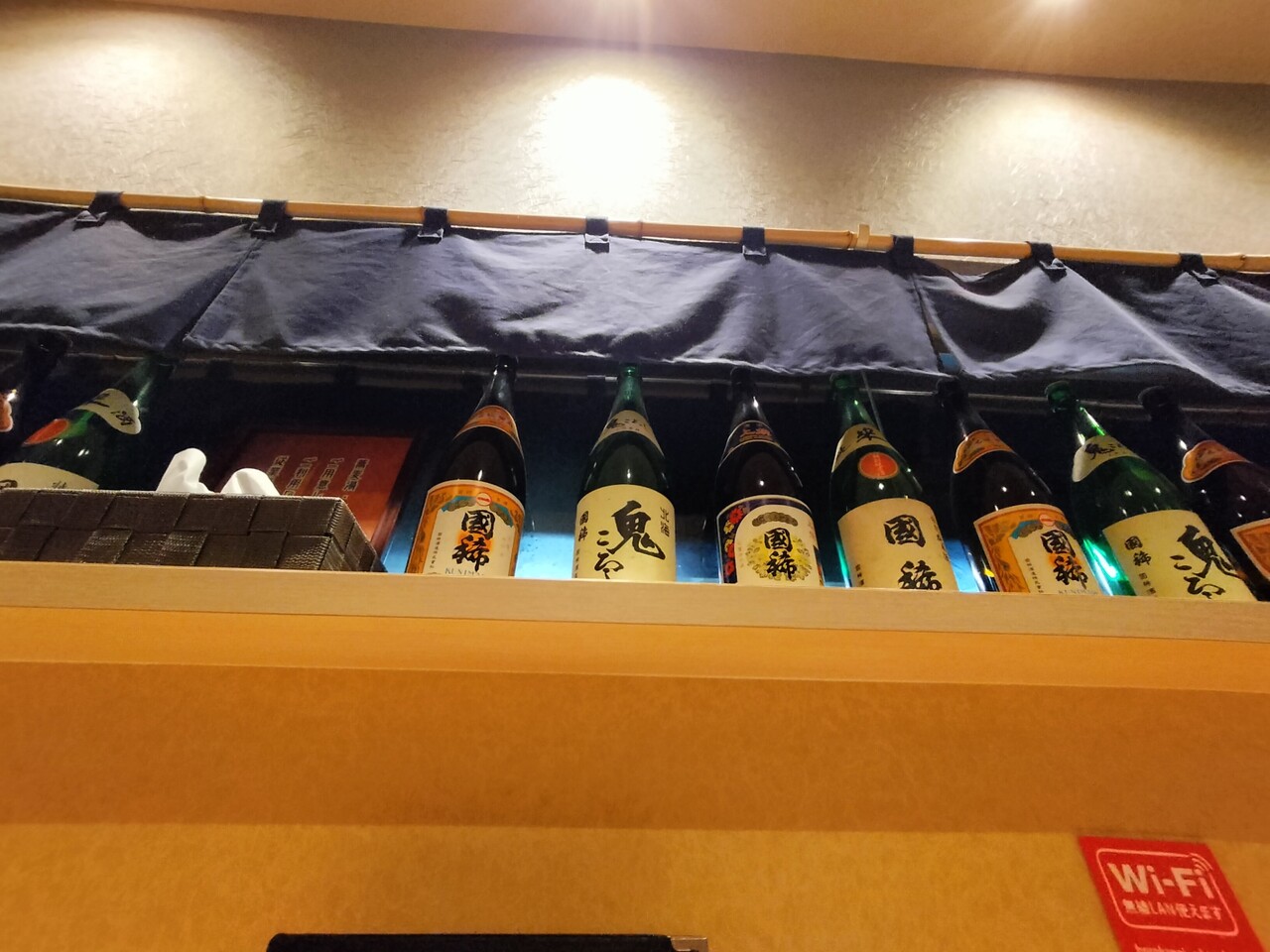 上を見上げると数々の日本酒の瓶が陳列されておりました