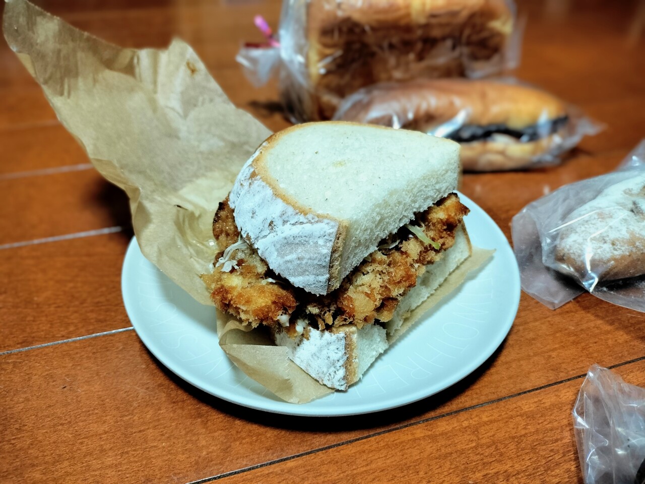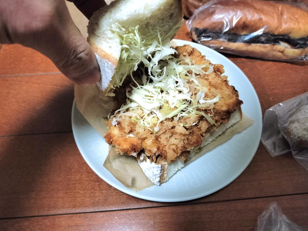 バリ美味パンに挟まれたチキンは分厚く食べるとモッチリとしたパンと チキンカツがボリューミーでバリバリ美味!
