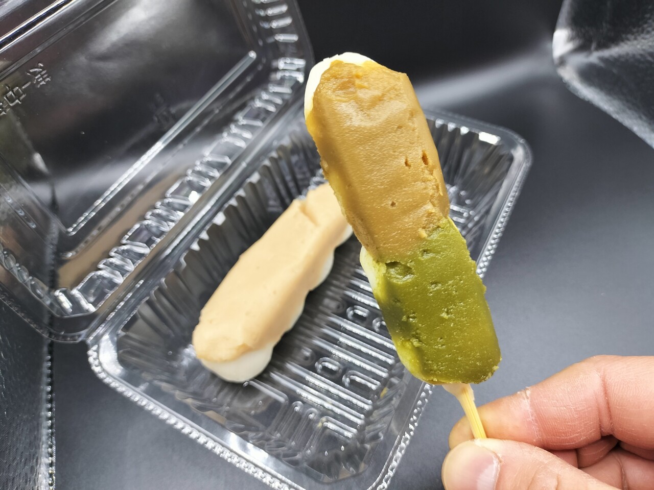 気を取り直して 抹茶ほうじ茶の団子を食べると抹茶とほうじ茶の香り感じられる団子でした