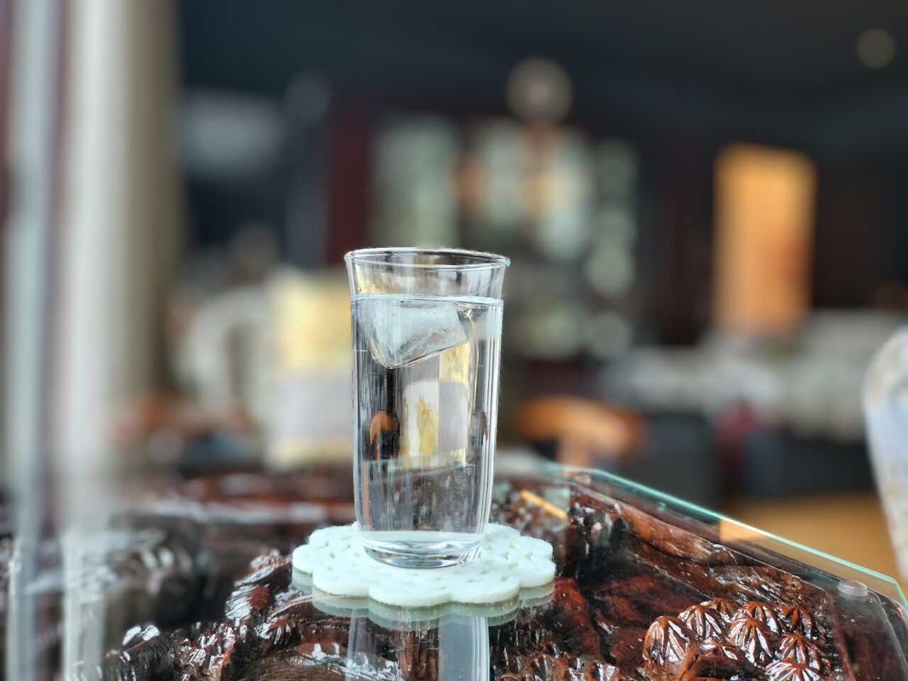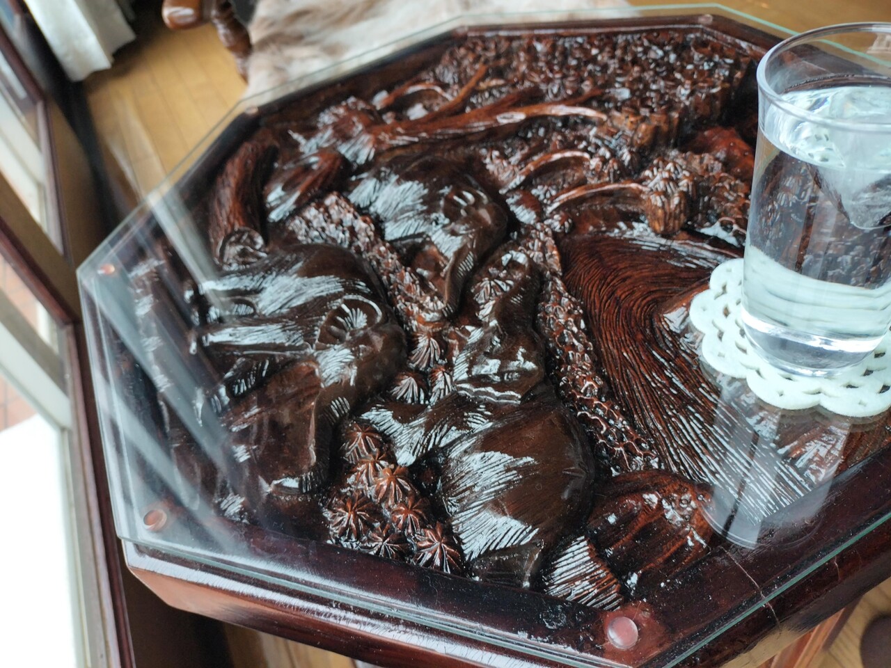 木彫りのテーブルで高そうって思う笑