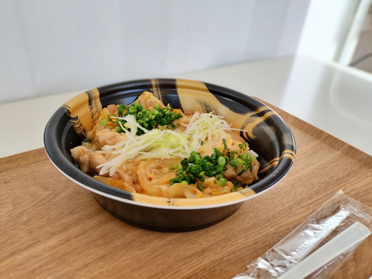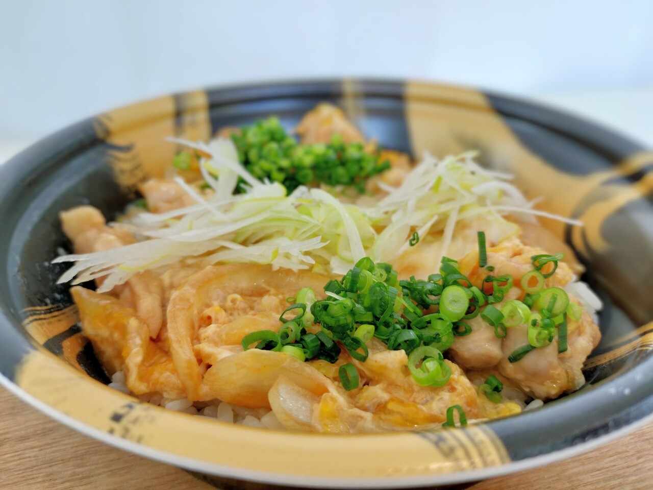 親子丼はシンプルで鶏肉、卵、玉ねぎ、長ネギの構成です