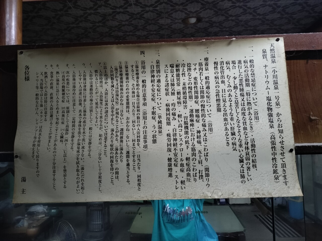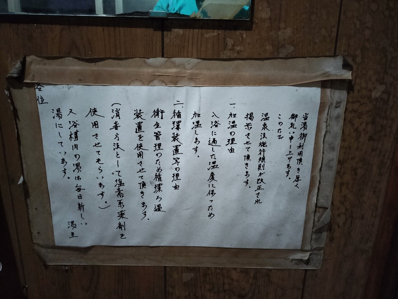 真正面にはこの様な貼り紙がなされており 加温、循環、消毒された湯である事が分かります