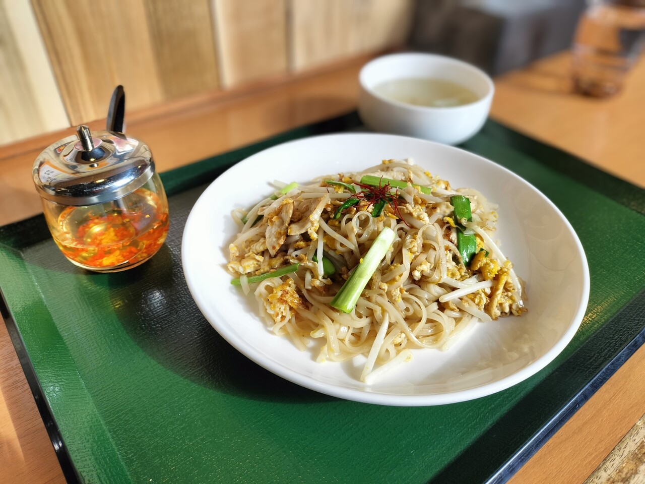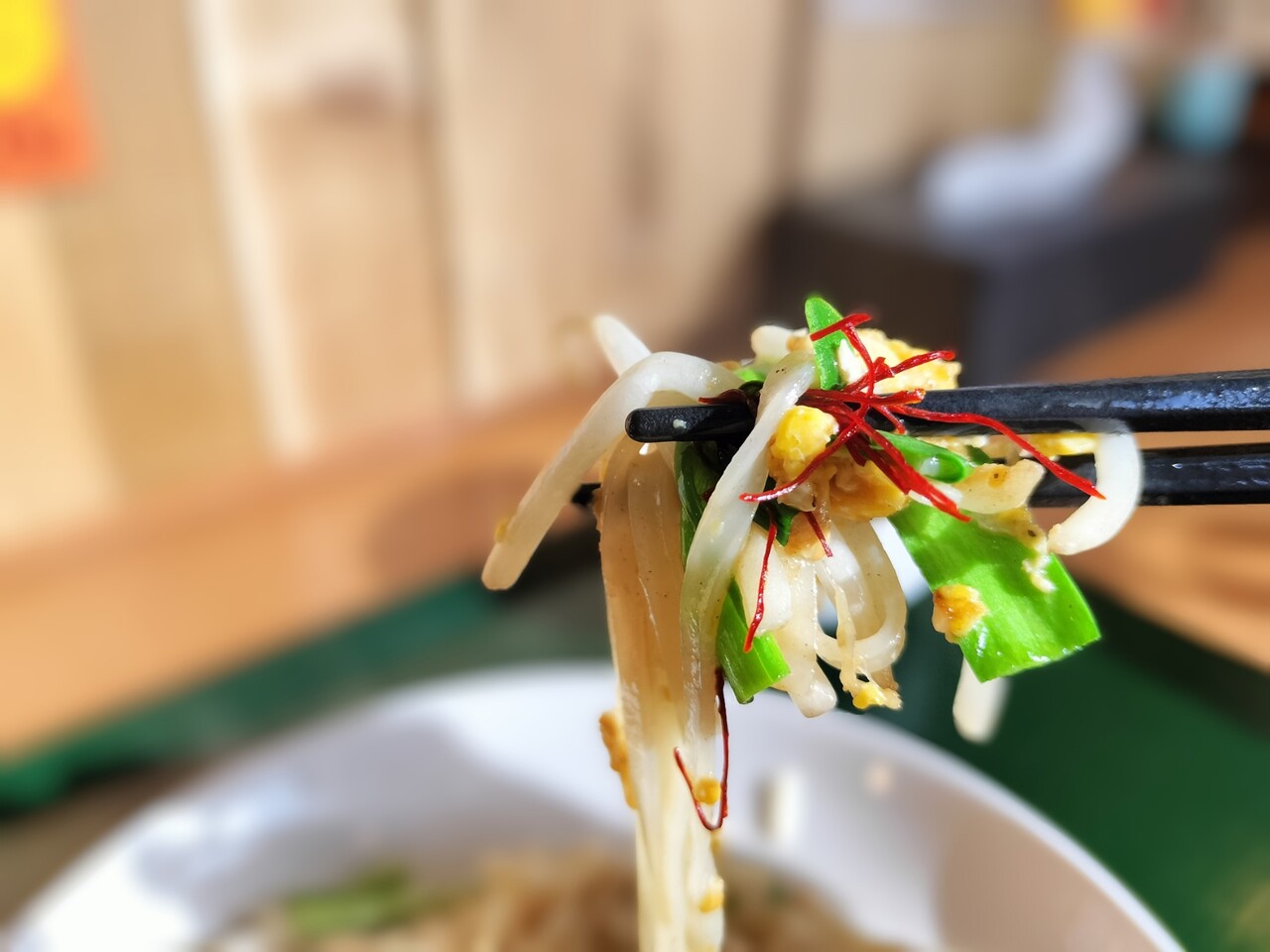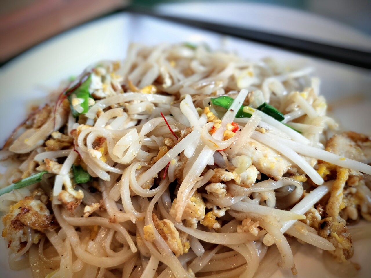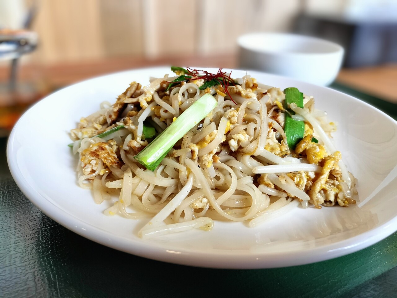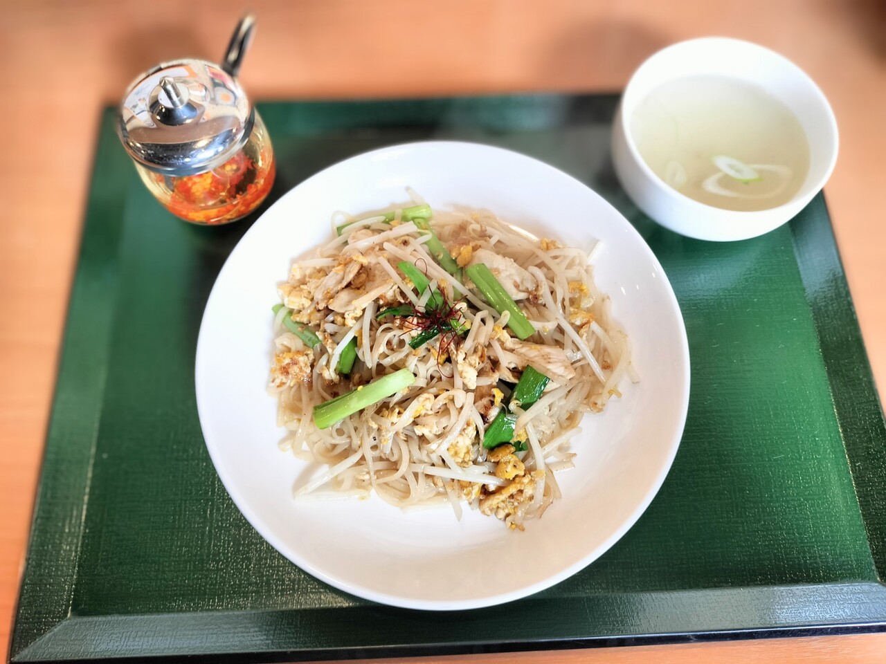 タイ風焼きそば パッタイ(米麺、ニラ、もやし、卵、糸唐辛子、豚肉)