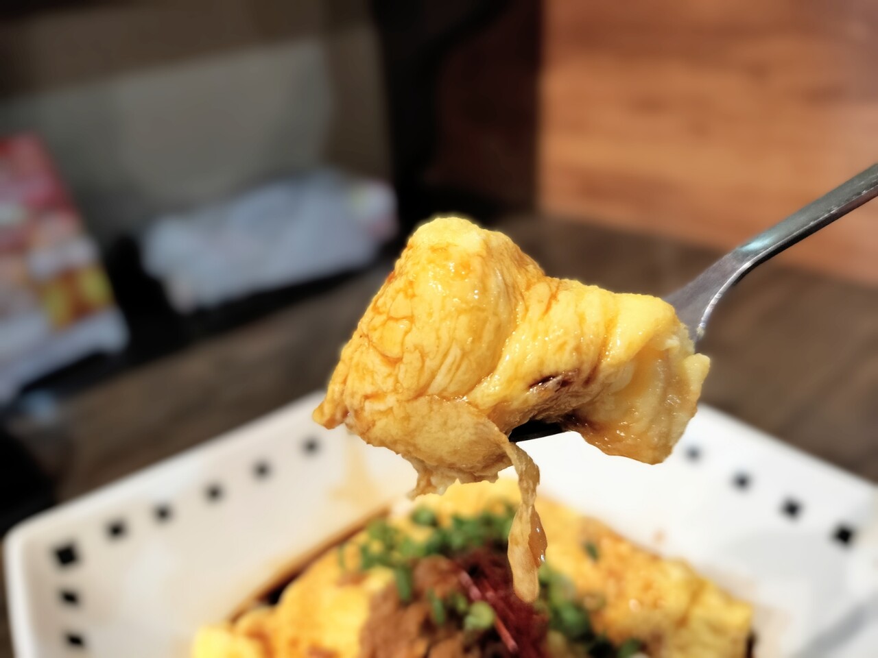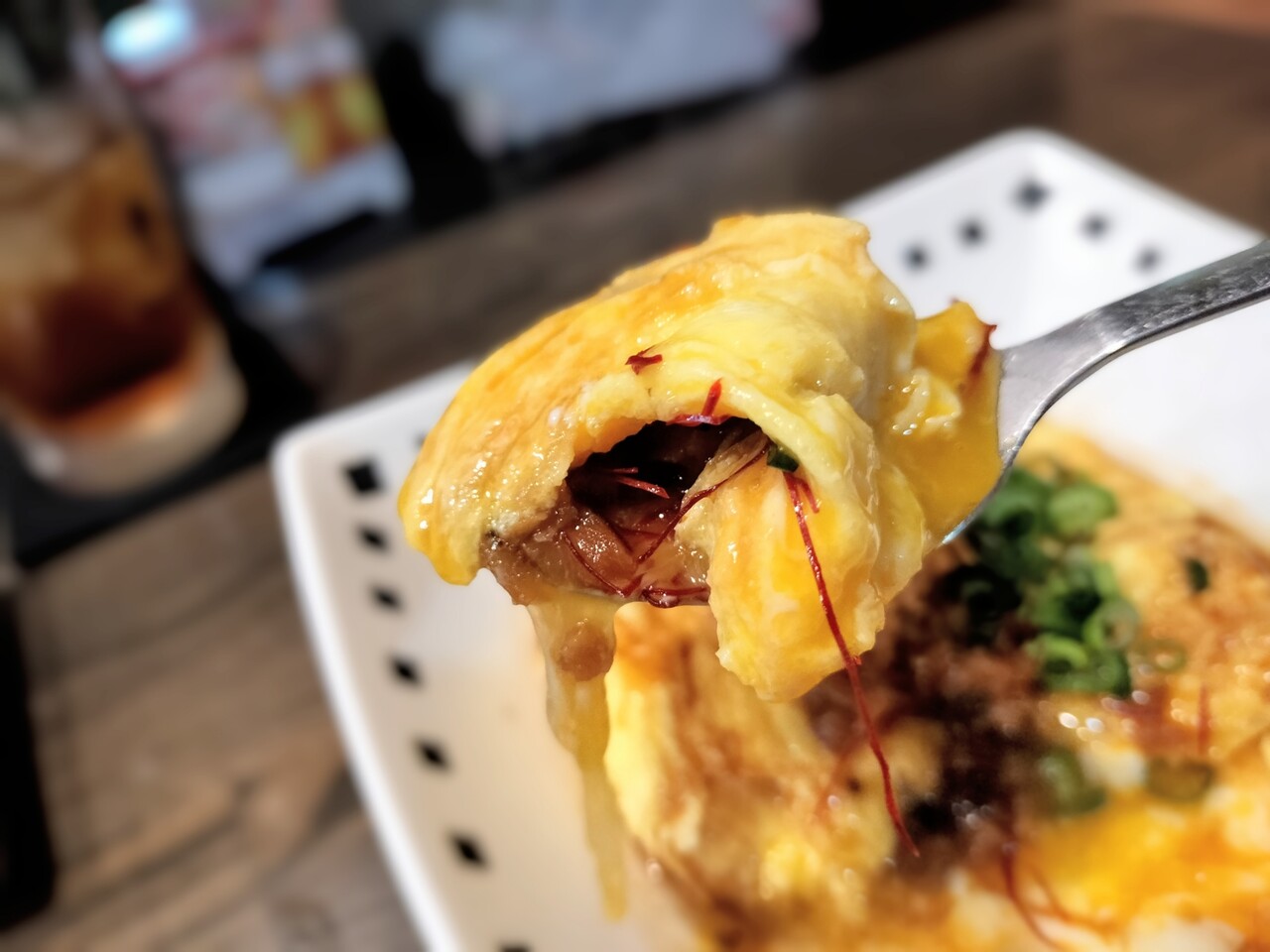 更にスプーンをたまご焼きに入れていくと 卵黄がとろとろっと中から溢れ出るんです