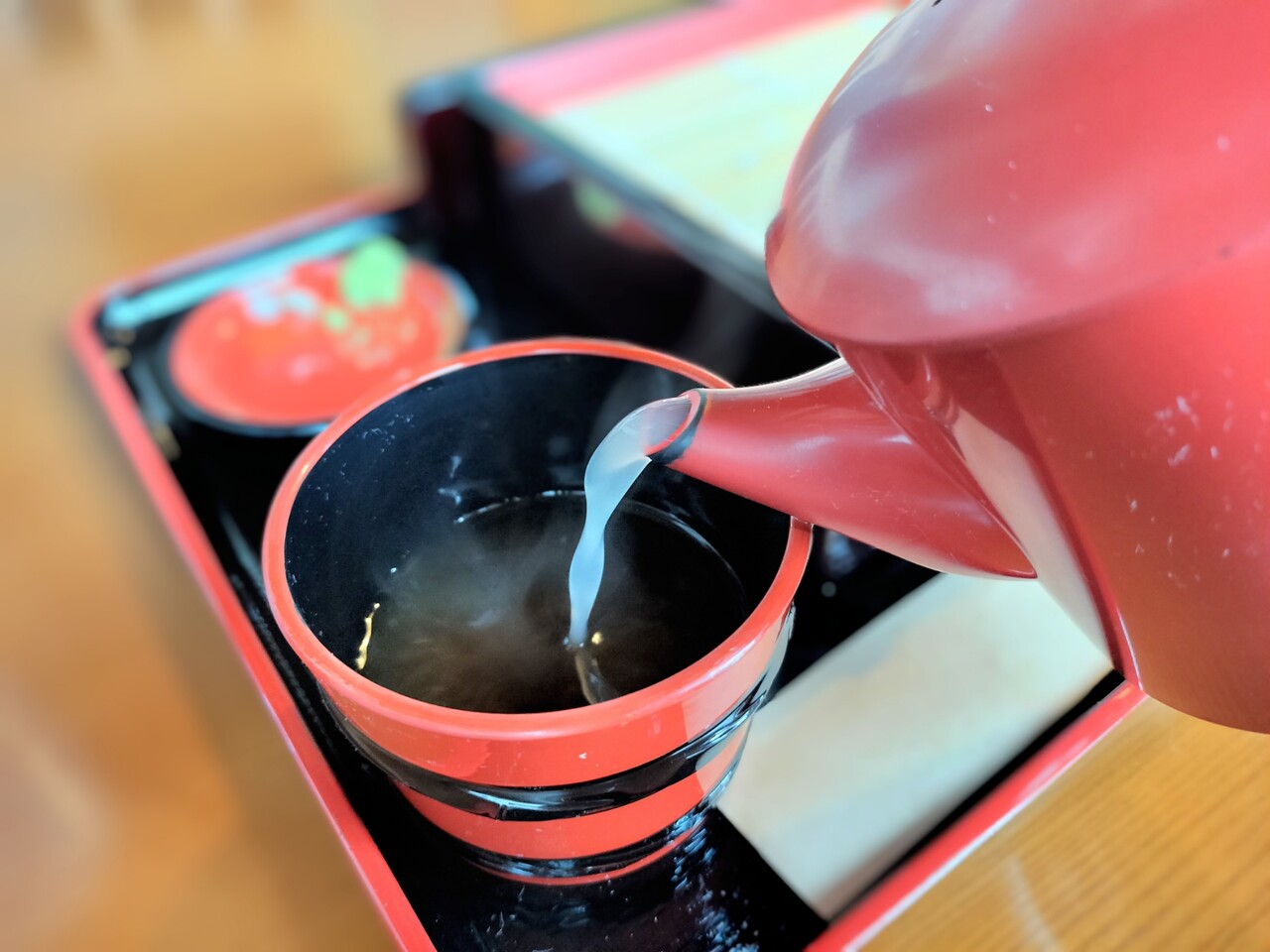 蕎麦つゆの残りに 蕎麦湯を注ぎ