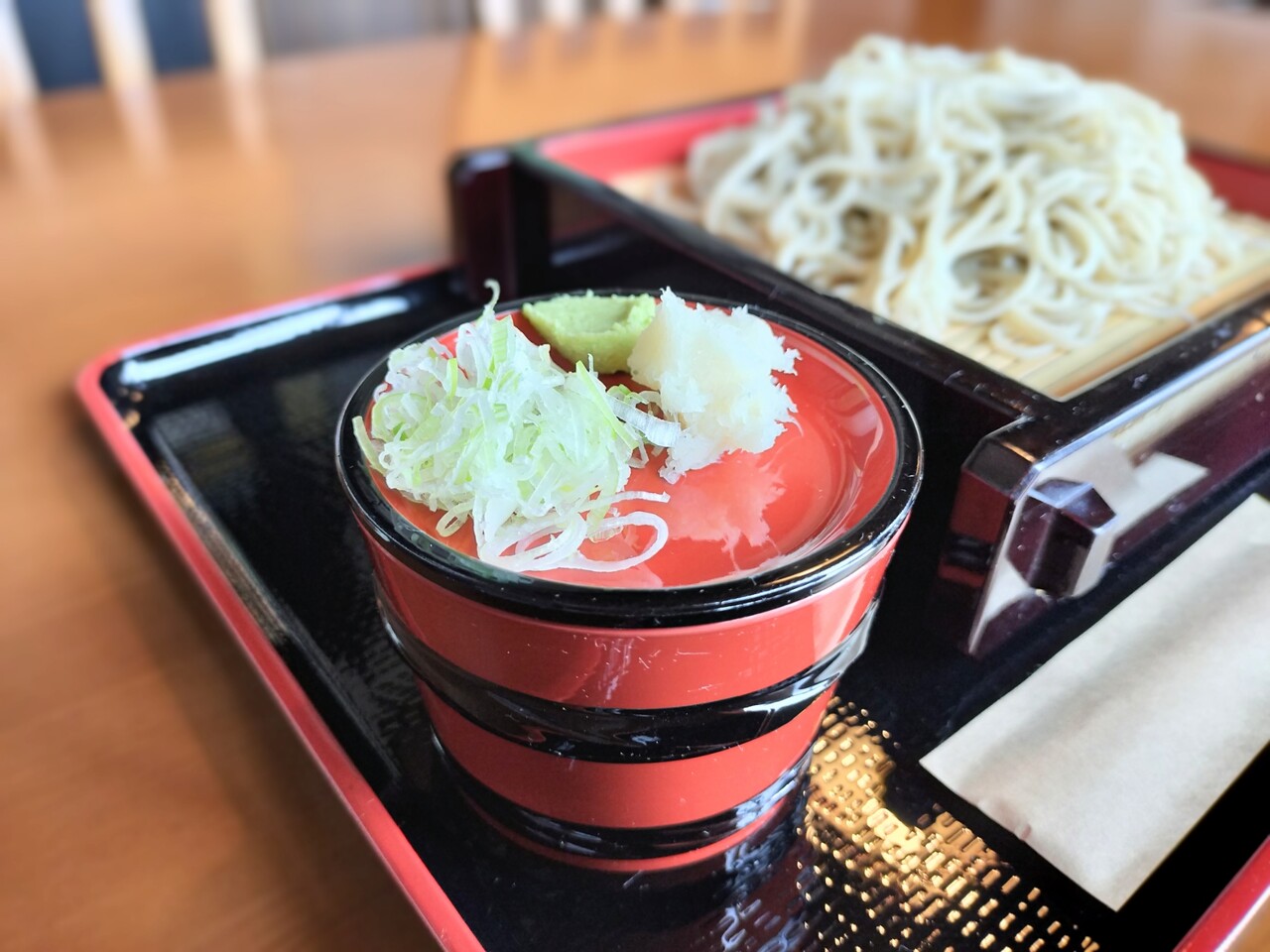 蕎麦汁と 薬味の長ネギ、辛味大根、わさび