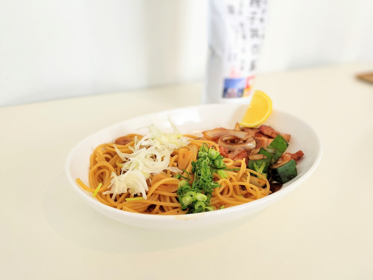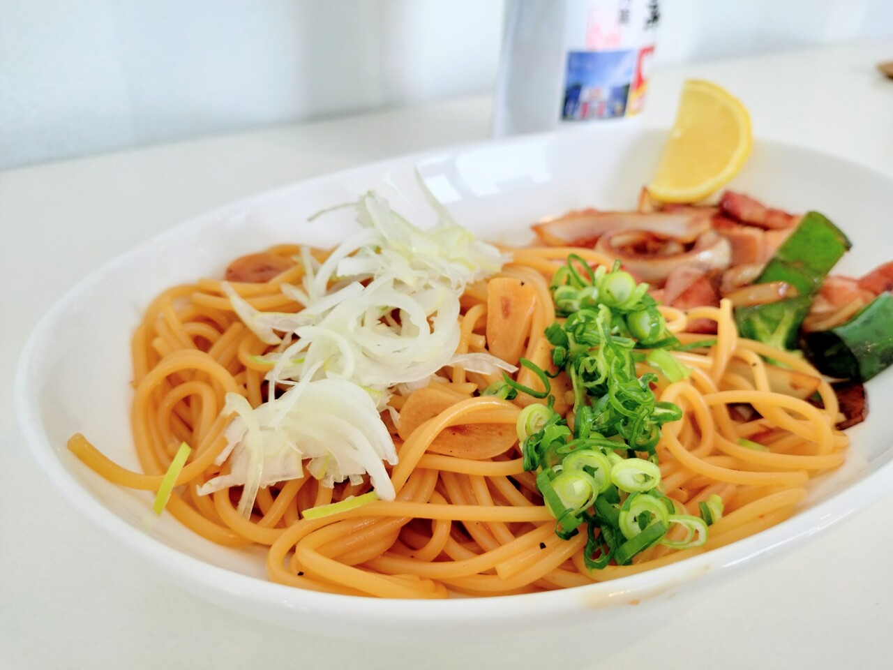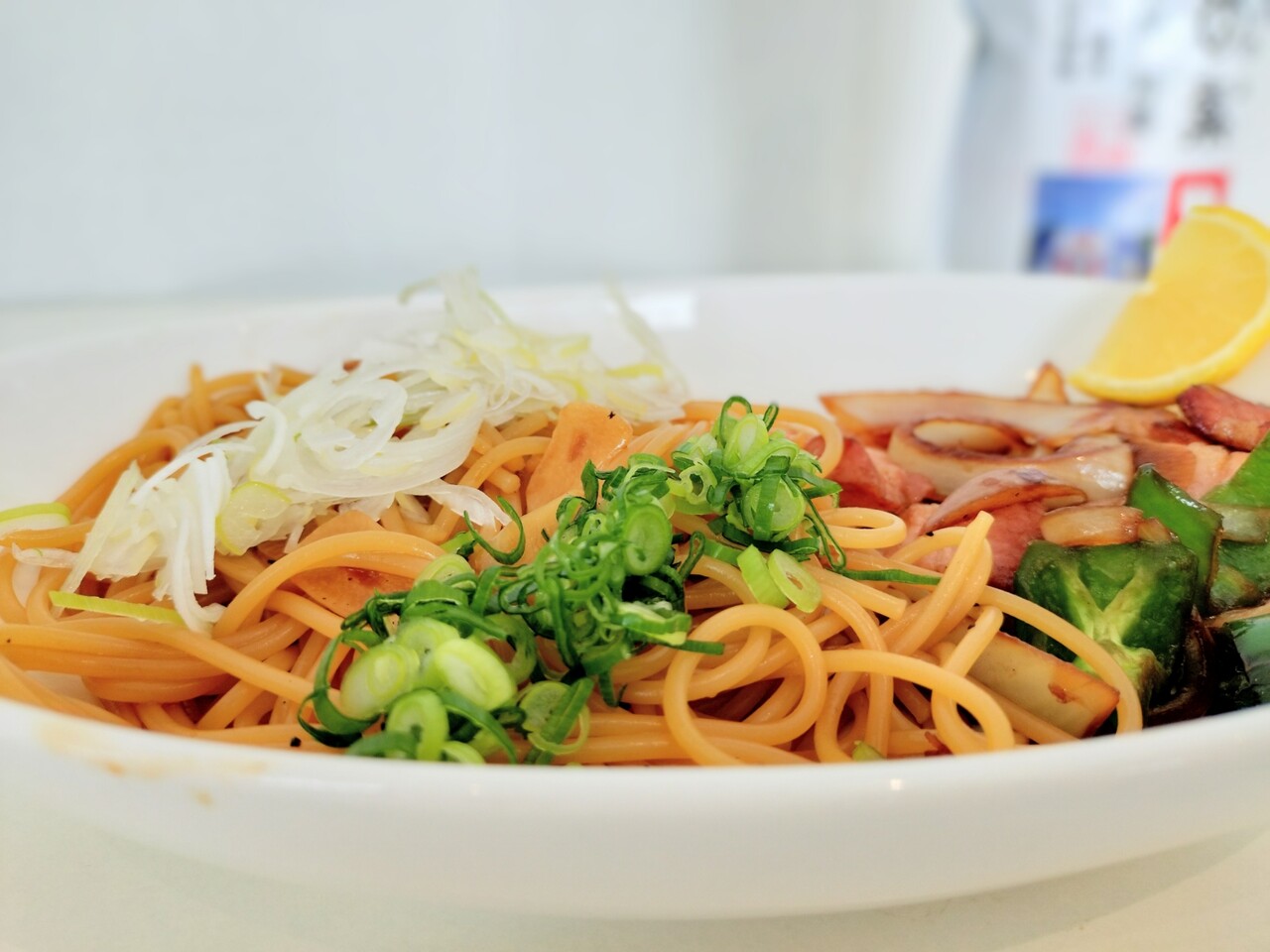 具材は 刻み長ネギ、ベーコン、ピーマン、玉ねぎ、アクセントのレモン