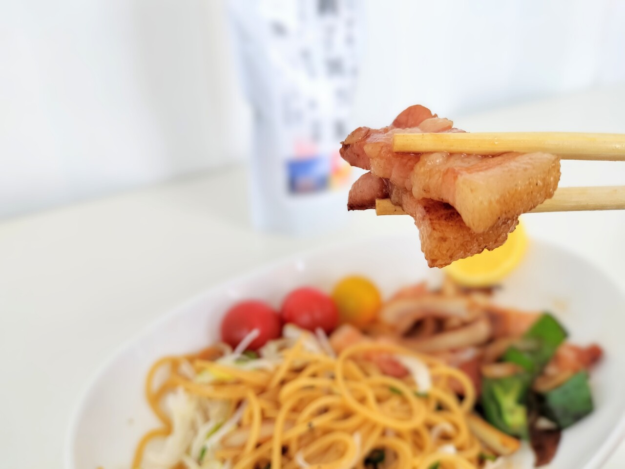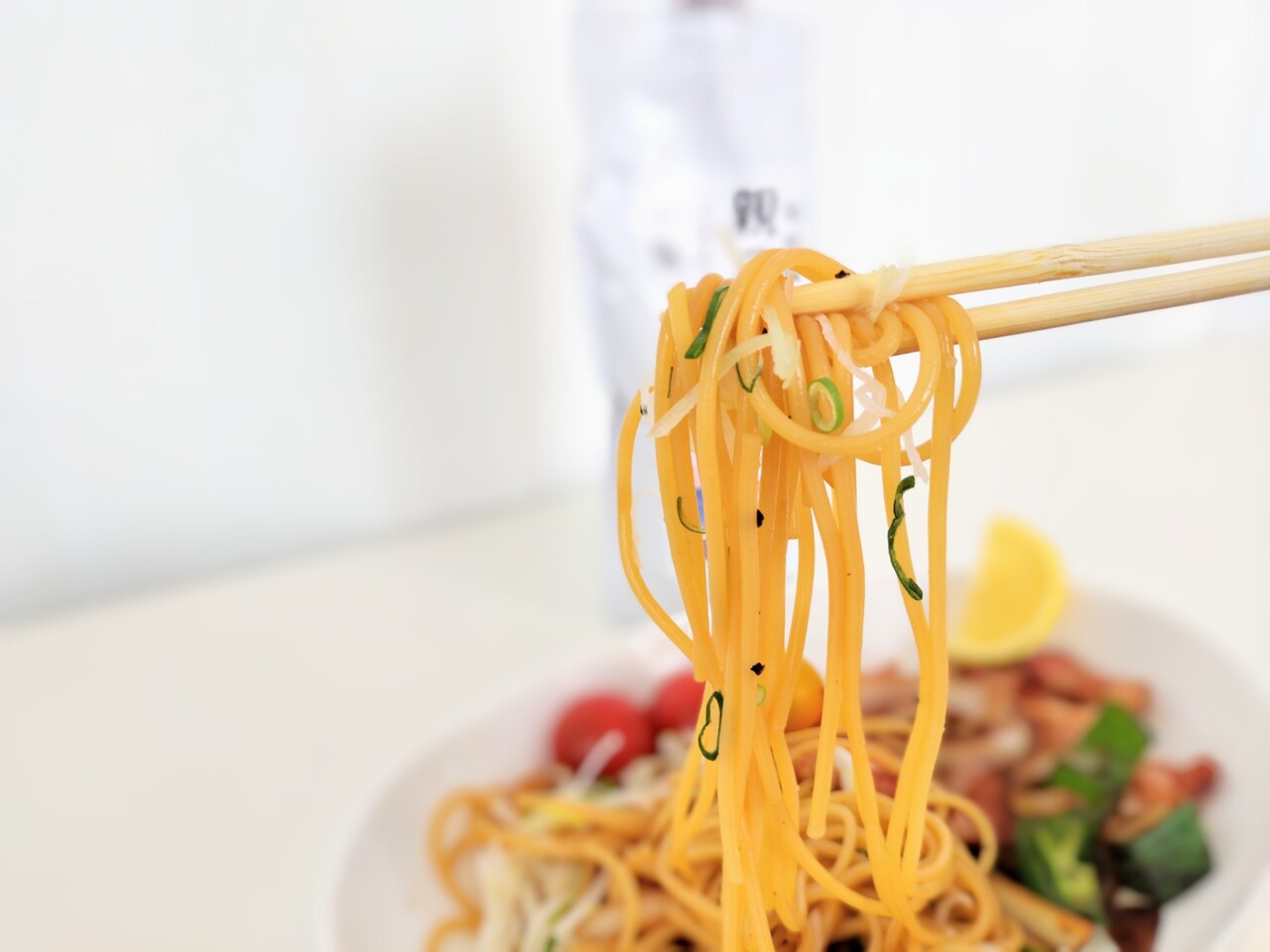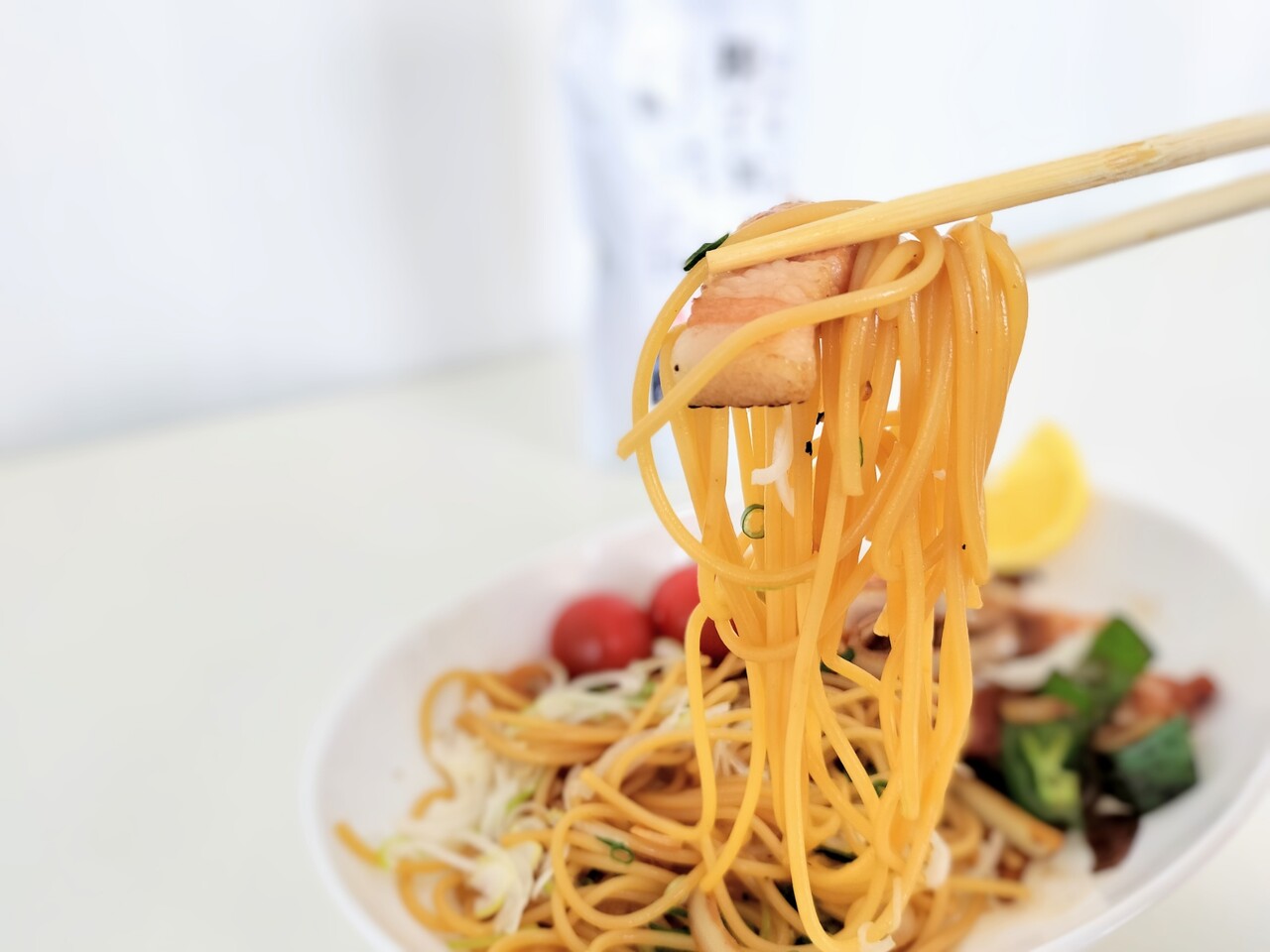具材は 刻み長ネギ、ベーコン、ピーマン、玉ねぎ、アクセントのレモン