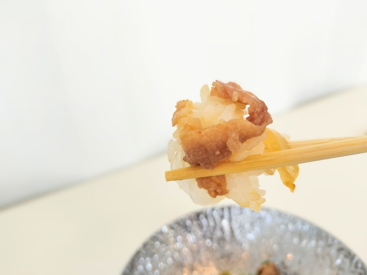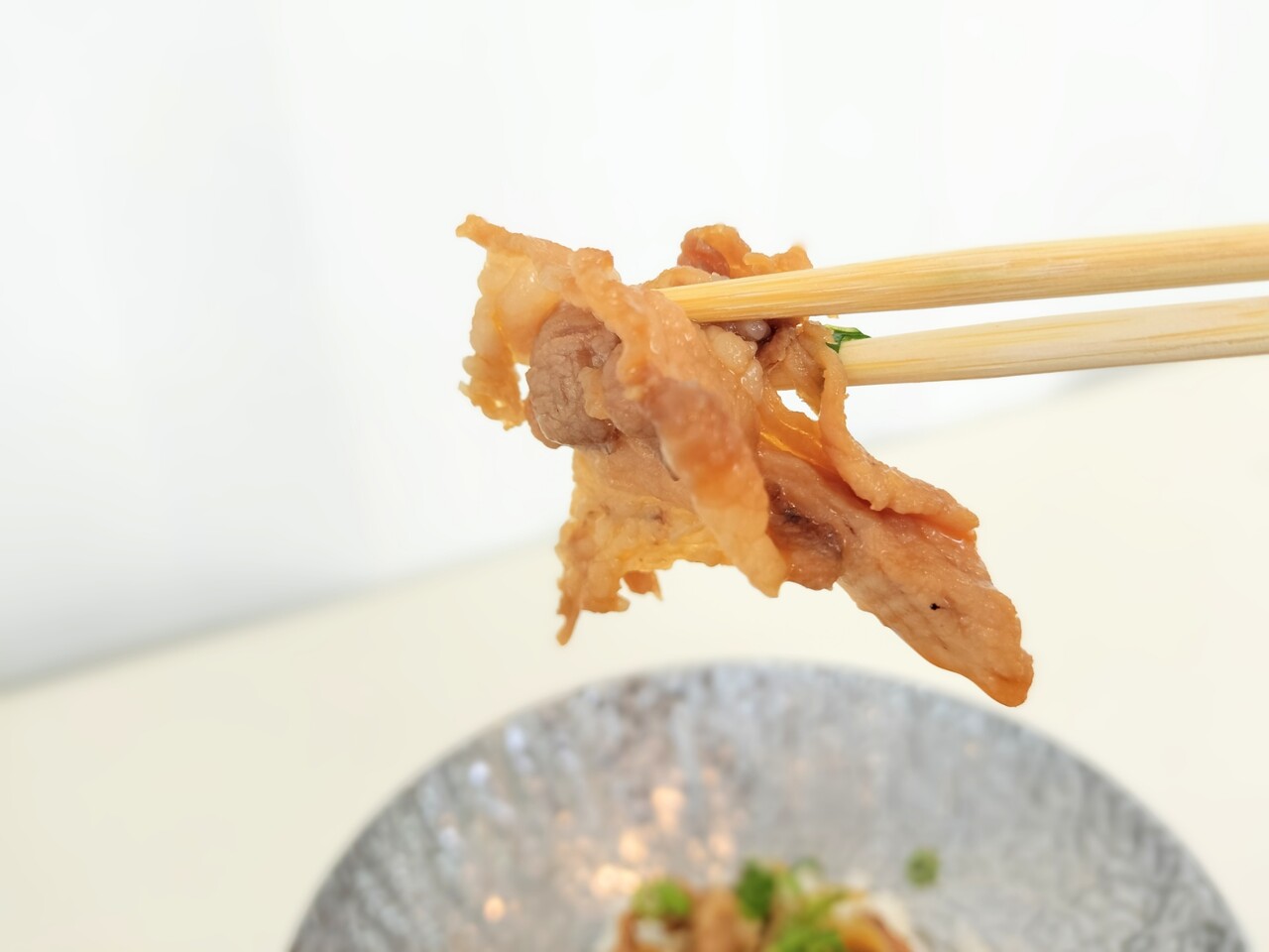 豚肉をパクリ食べると 甘しょっぱい味わいで それが豚肉に染み込み美味い!