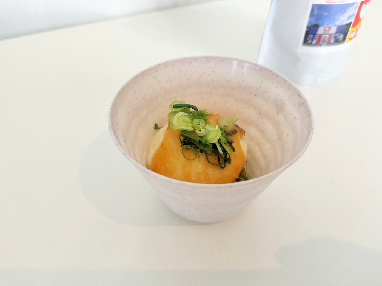 瓢亭卵を少し揚げて 親子丼の素を片栗粉でとろみを付け垂らし 刻み長ネギらわさびが添えられたものです
