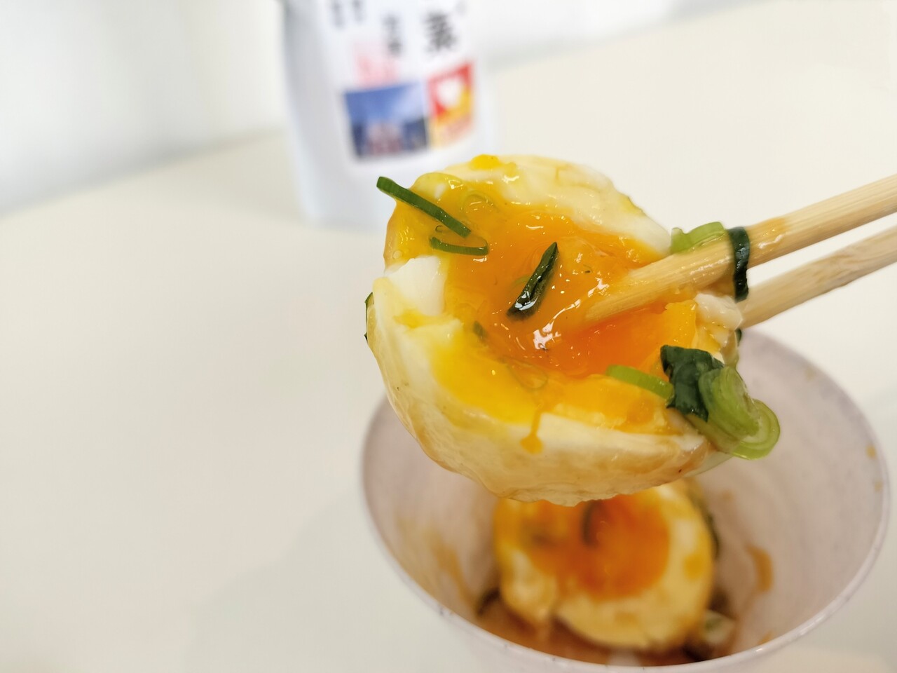 箸でパックリ笑と 半熟の黄身がとろ〜りとしておりビジュアルで美味しいを確信、食べると確定 とろ〜り卵黄と少し濃い目の甘しょっぱいタレとわさびの辛みの3ピースが美味し過ぎて堪らない