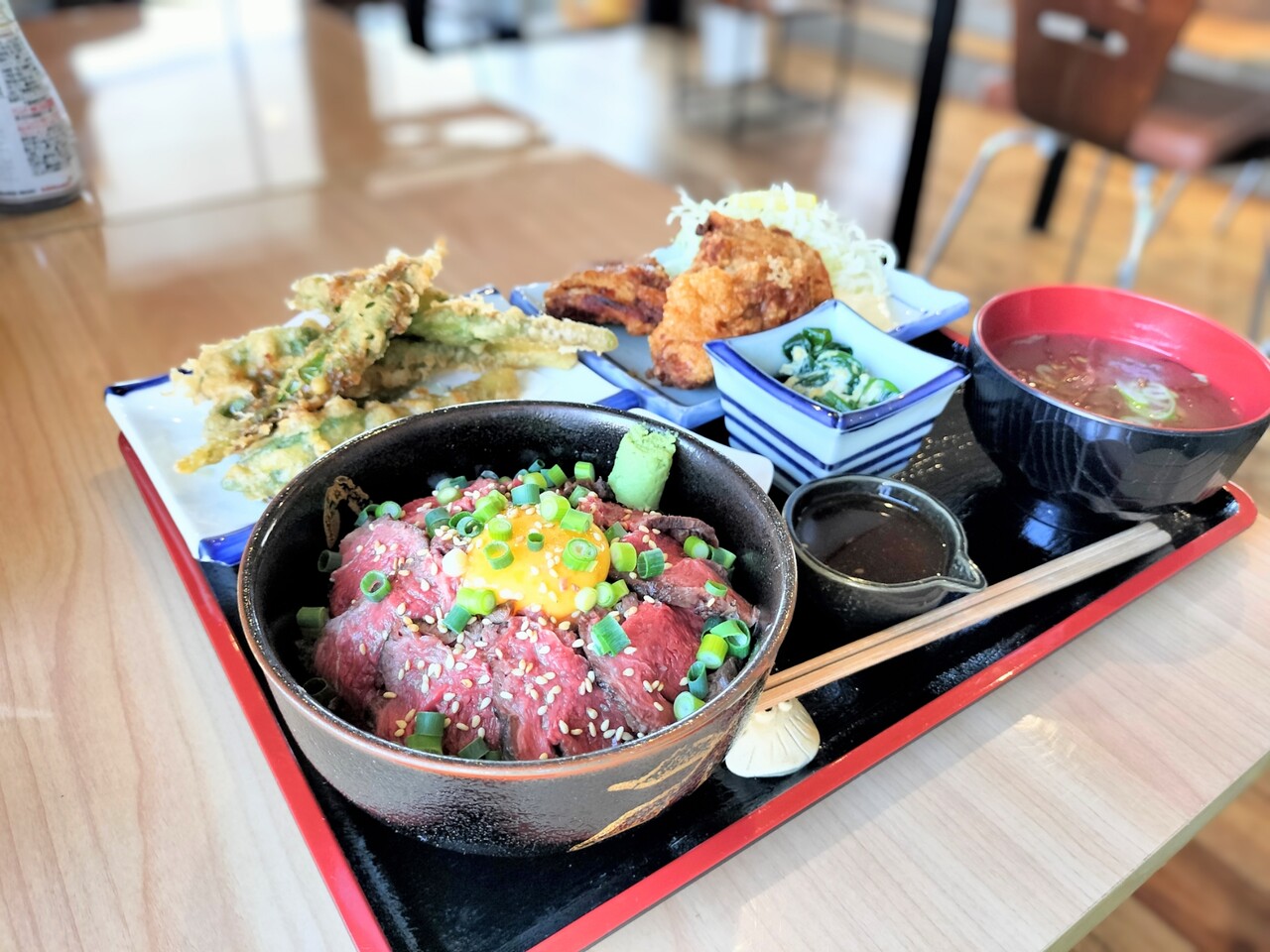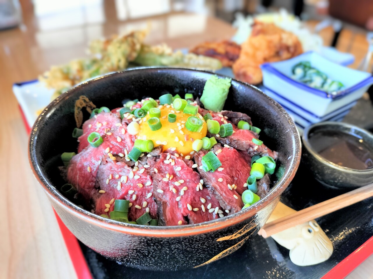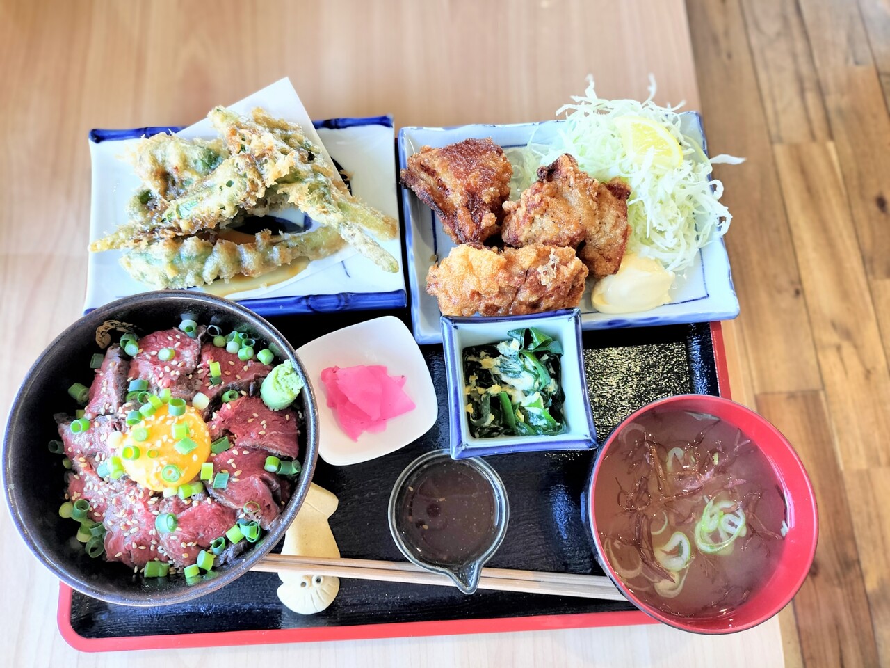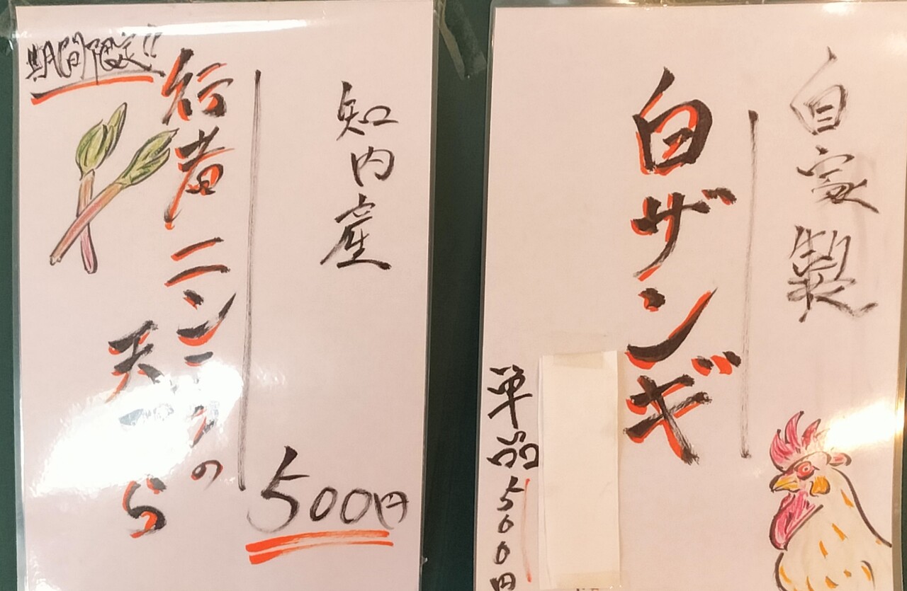 エゾシカロースト丼(¥2,000)と自家製白ザンギ(¥500)&知内産行者ニンニク天ぷら(¥500) この3点をオーダーします