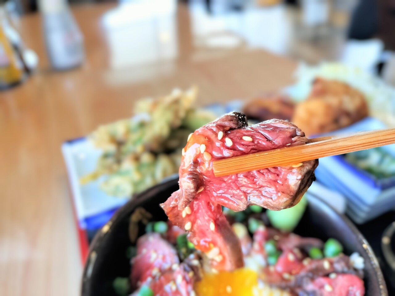 卵黄を崩し鹿肉に纏わせ食べるエゾシカ肉も本当美味い!卵黄のまろやかさ、特製タレの甘み、臭みの無いエゾシカ肉… 本当最高!