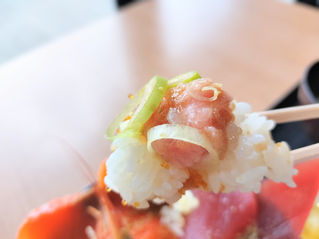 丼からはみ出る海鮮達(サーモン、鮪、エビ、ネギトロ、とびっこ等)