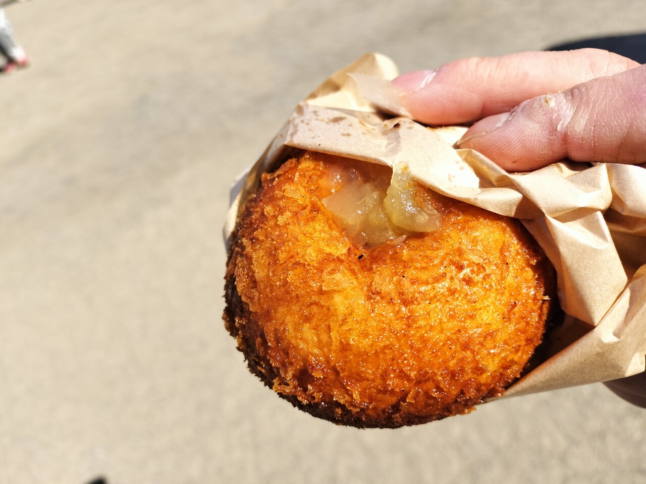 食べるとちょっと外側カリっと半スパイシーなカレーですが りんごジャムの甘みが良いバランスとなり美味い!