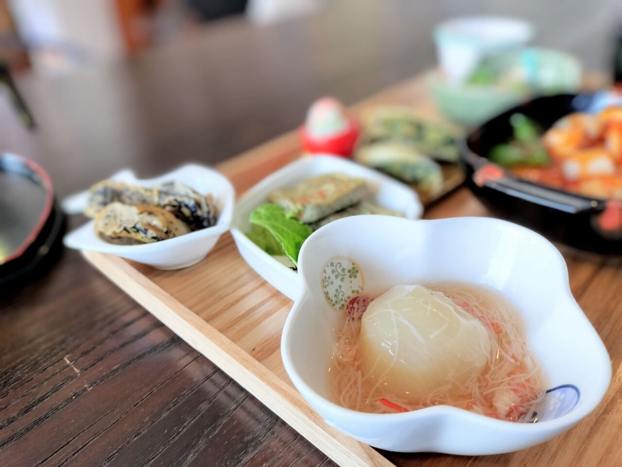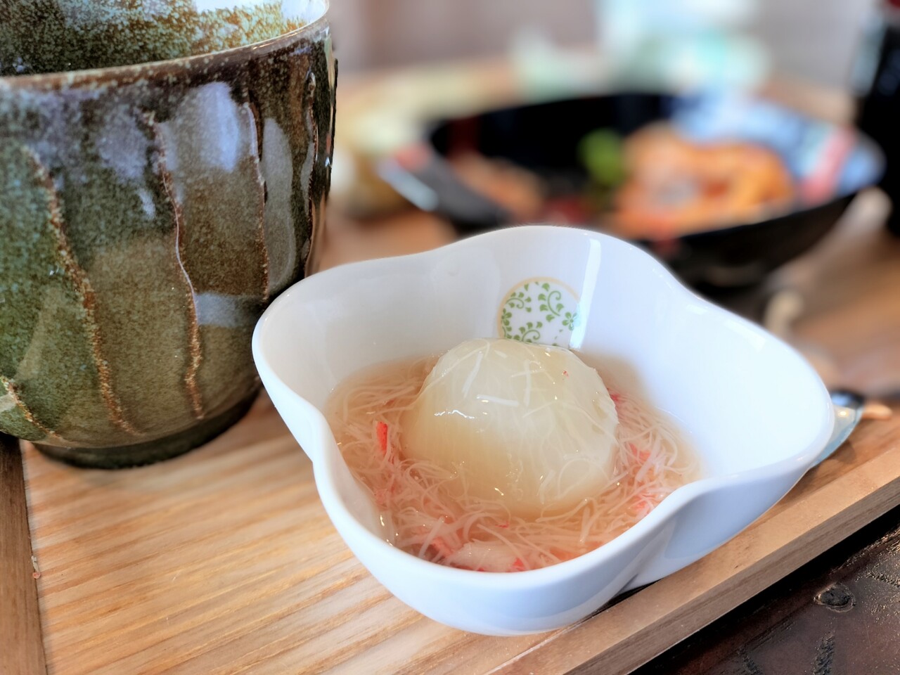 蕪のあんかけ、ツブ煮、蟹味噌の茶碗蒸し風