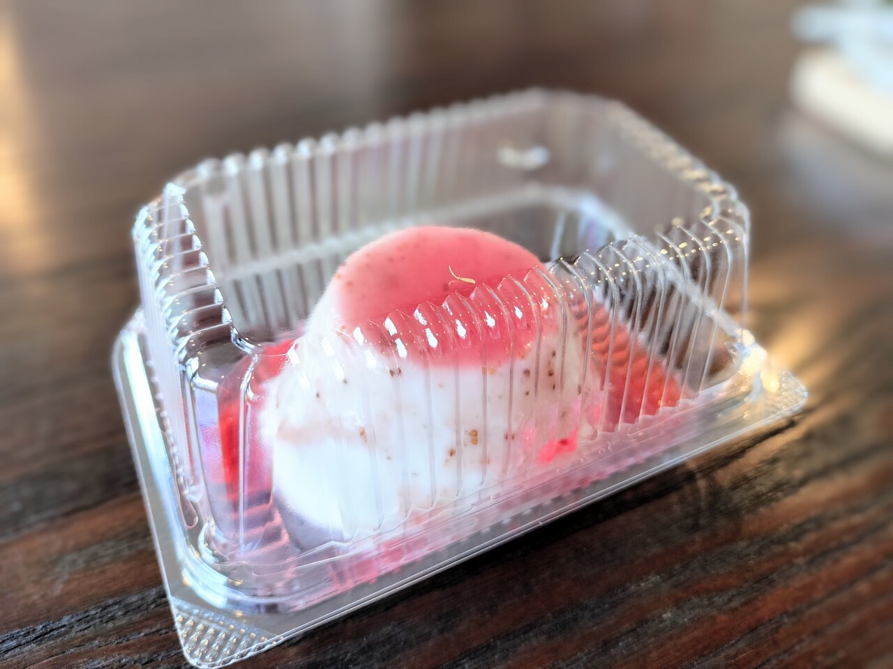 振るとぷるんぷるんと荒ぶっておりますが食べると繊細で すっと溶けていく感じで 苺ソースも相まってバリ美味!