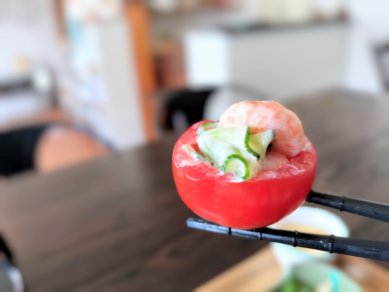 春巻きに添えられていて ミニトマト!中にはきゅうりとエビが入っております。食べるとトマトの甘みとエビの甘みマヨネーズの甘みが良い感じに交わり美味いんだなぁ。きゅうりの食感もマスト