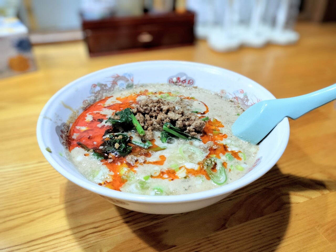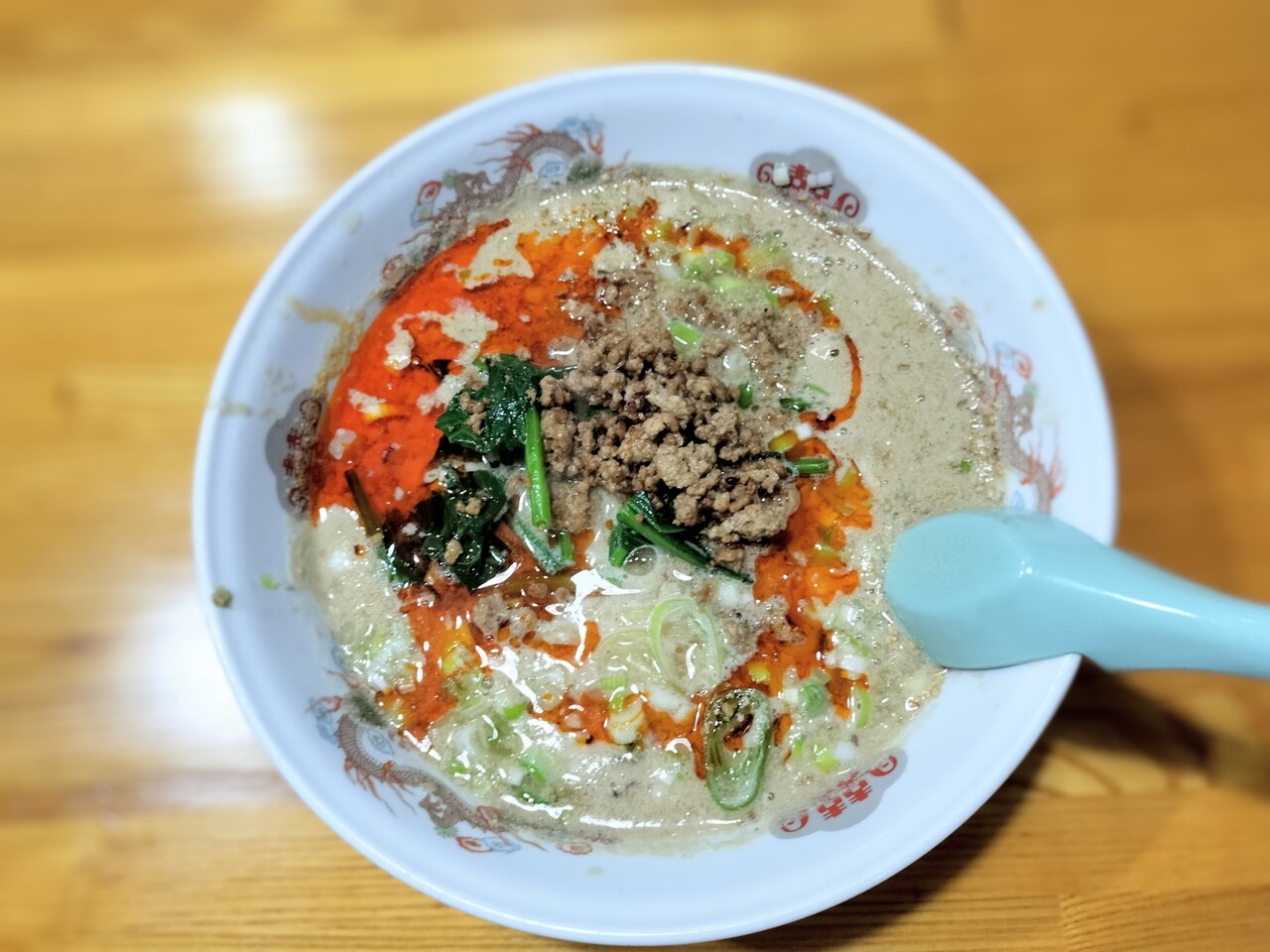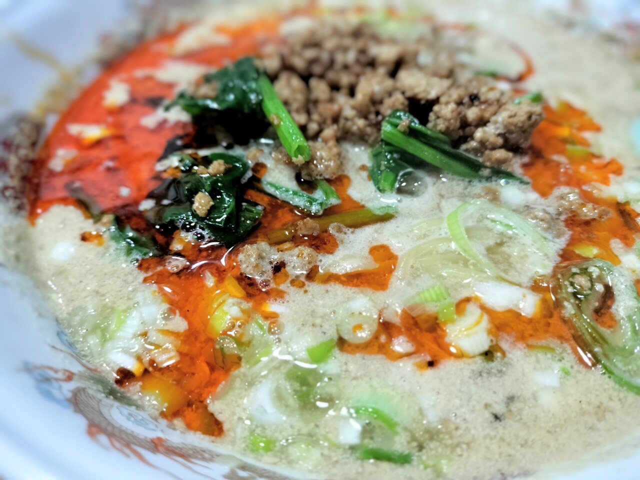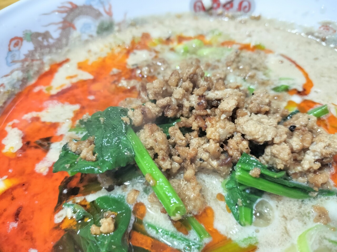 胡麻みそスープの上には豚挽肉、ほうれん草、長ネギ、擂り胡麻、辣油 他の内容となっております