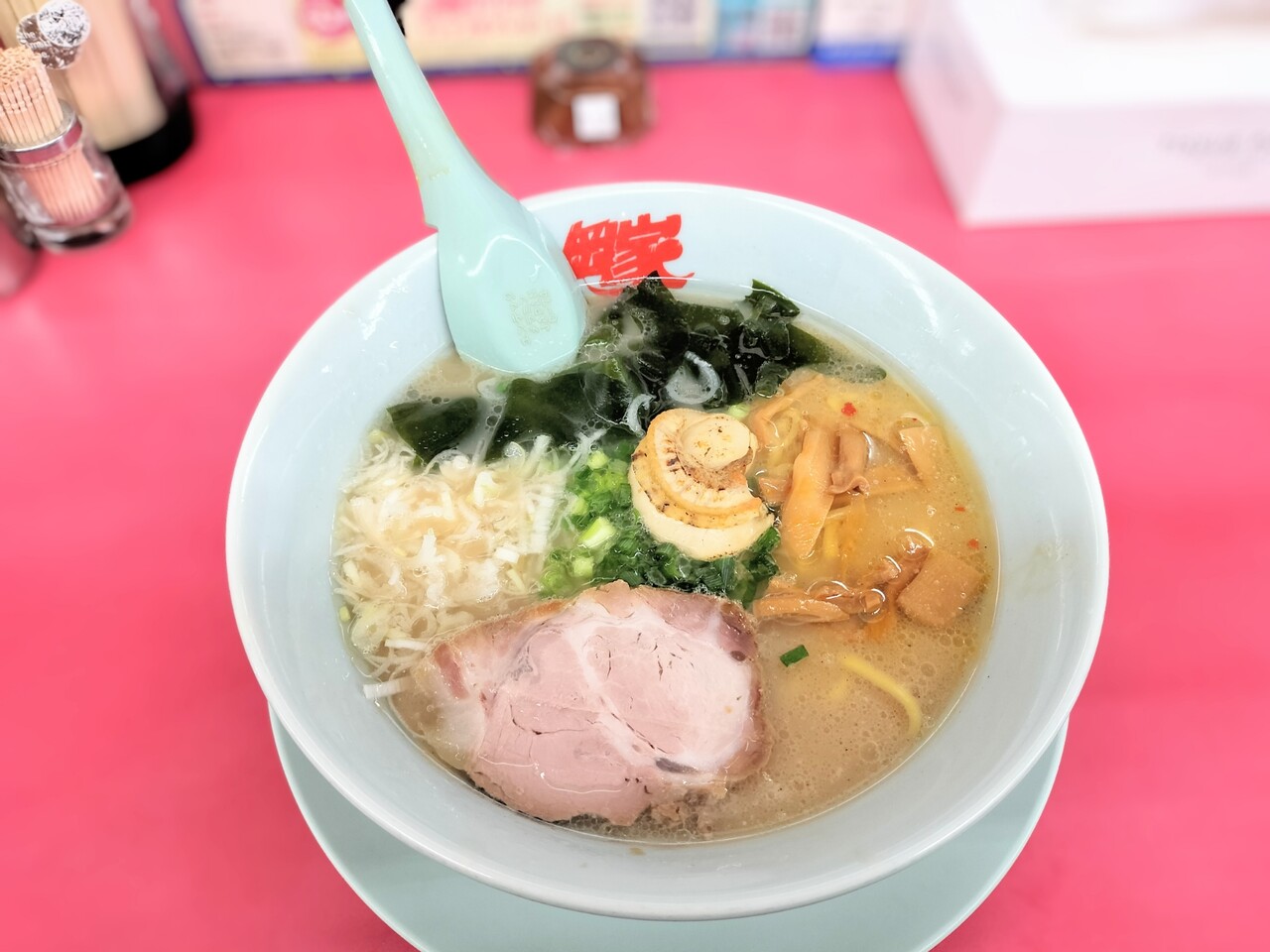 中央にホタテが乗っていております(長ネギ、ワカメ、メンマらチャーシュー)