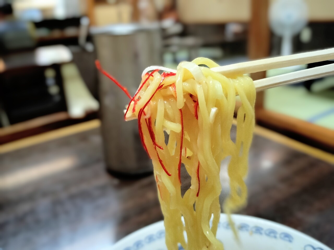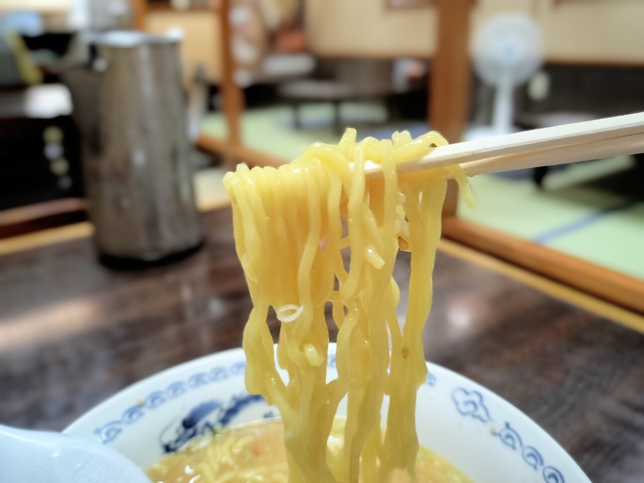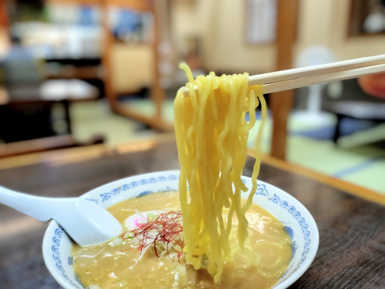 先ずは麺を持ち上げると 黄色の中太縮れ麺でズズっと啜るとスープもよく絡みます