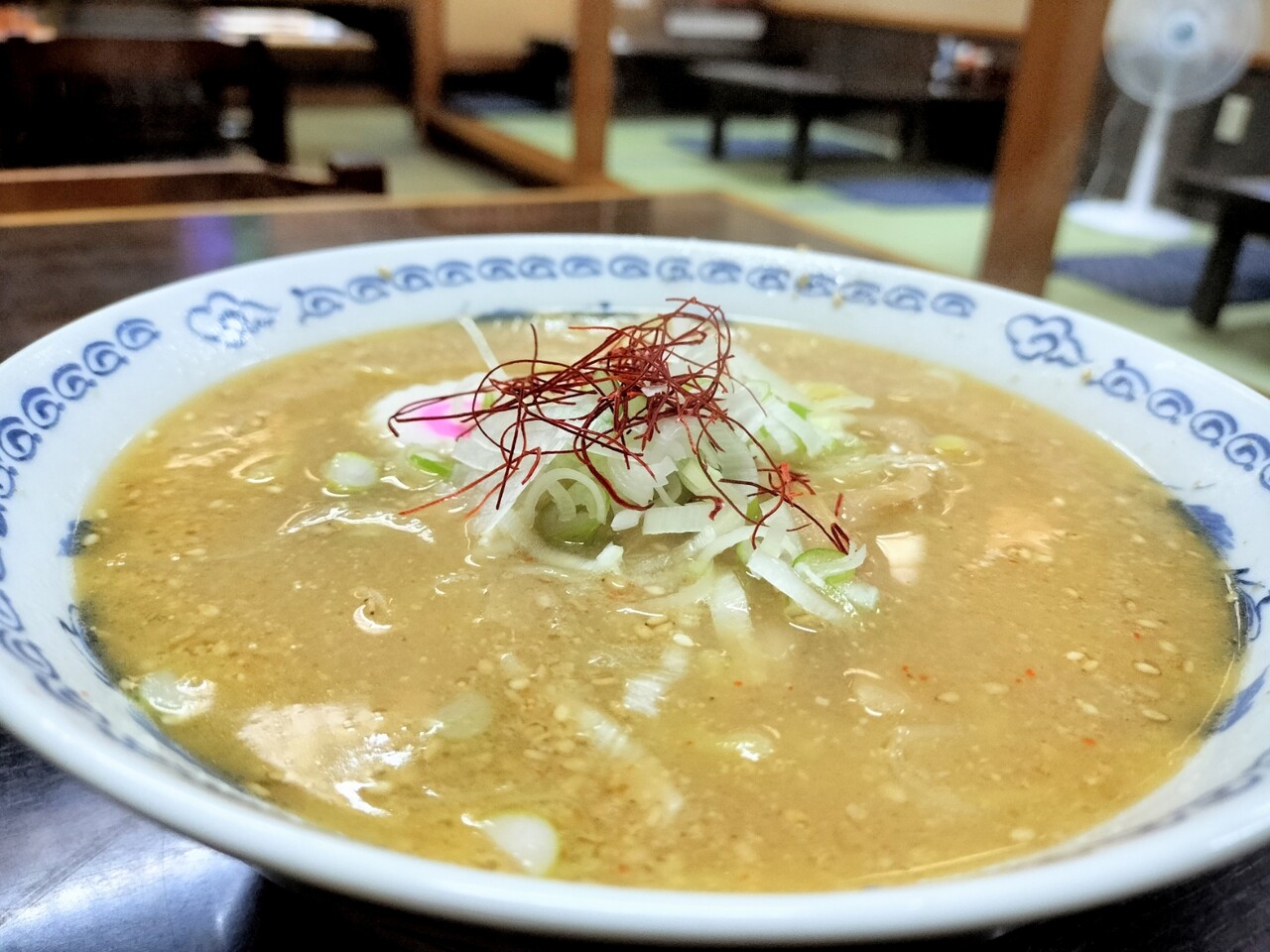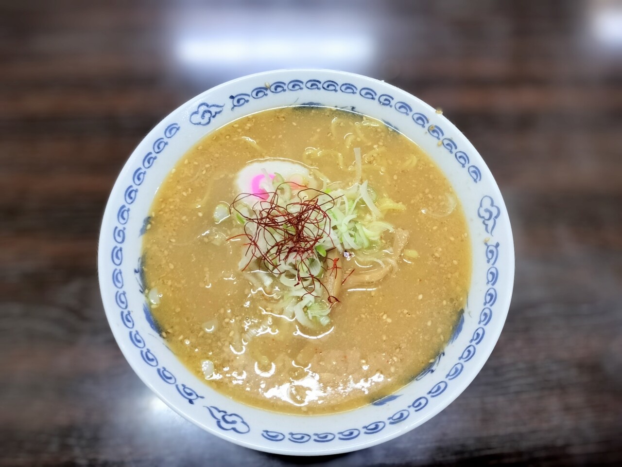糸唐辛子、長ネギ、ナルト、メンマ、チャーシュー、スープに白胡麻がプカプカと浮いており