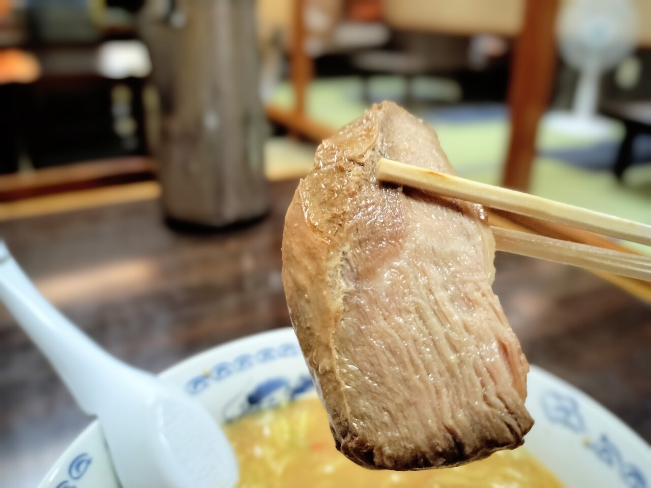 チャーシューは歯応えのある感じで ちょっと塩っぱかったかな?でもスープと一緒なら…