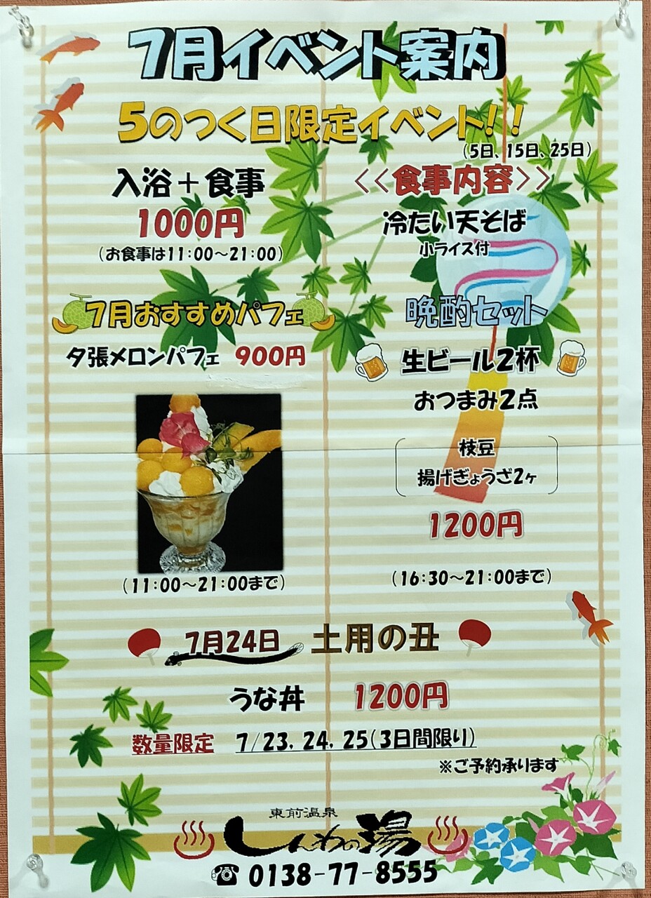 そして壁を見ると5の付く日には入浴&食事が¥1,000で利用できるイベントが毎月あるようです