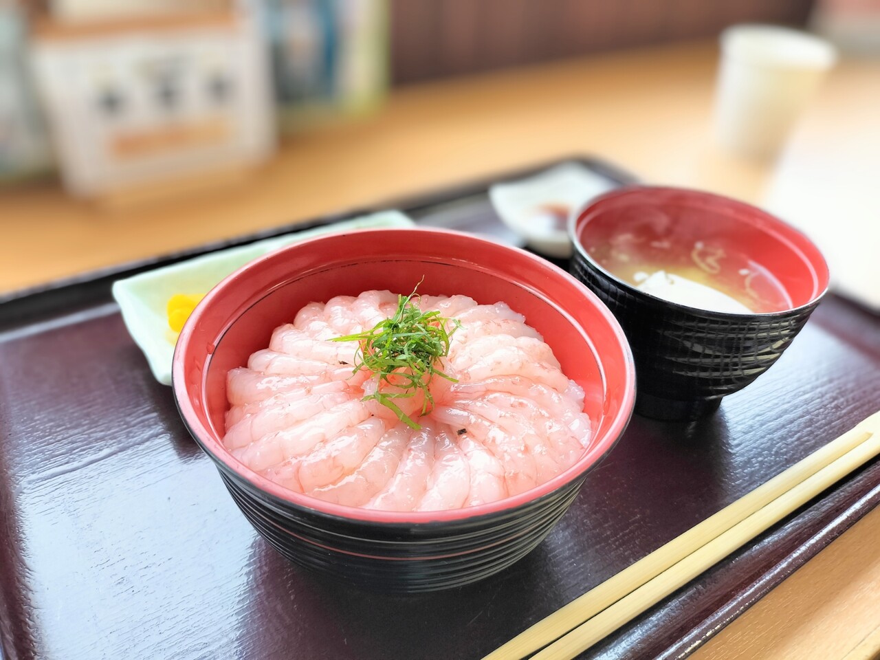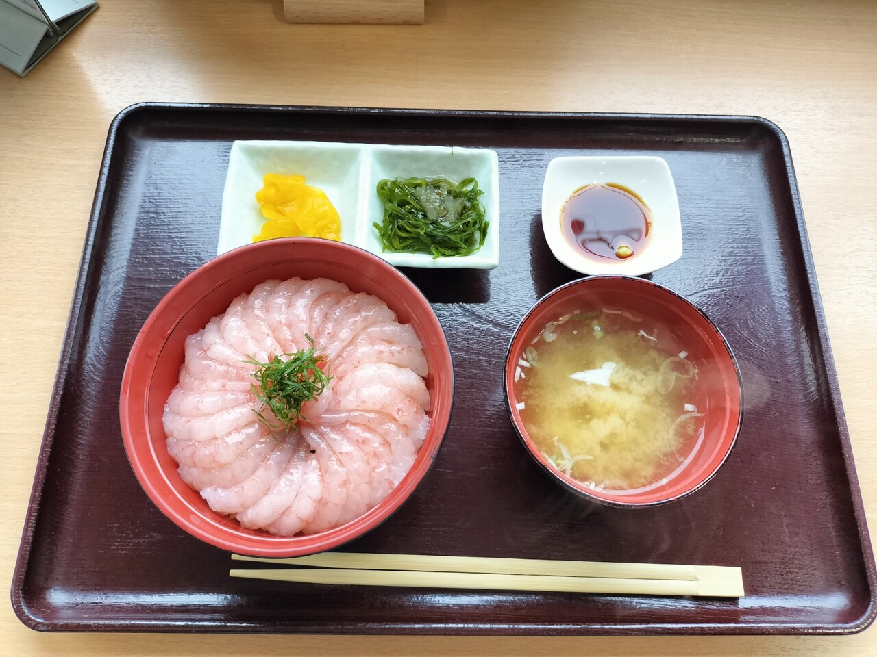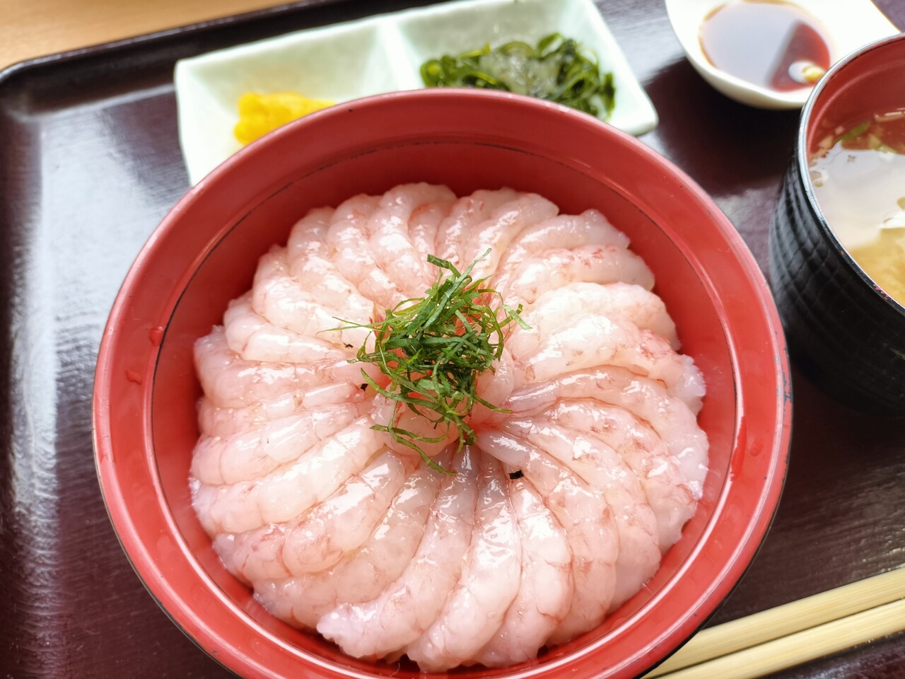 浜の母さん達の作業をみながら5〜6分ほど待っていると番号呼ばれたので甘えび丼を受け取って参りました