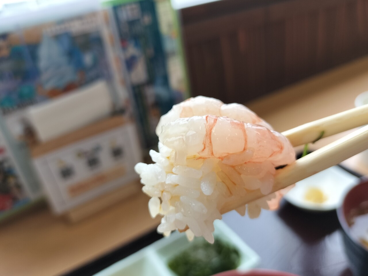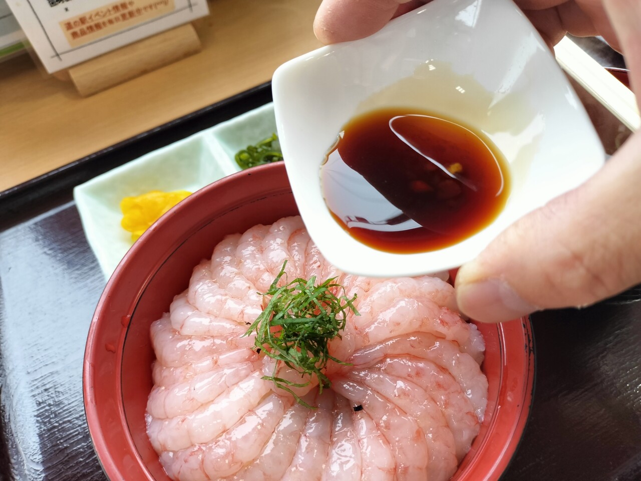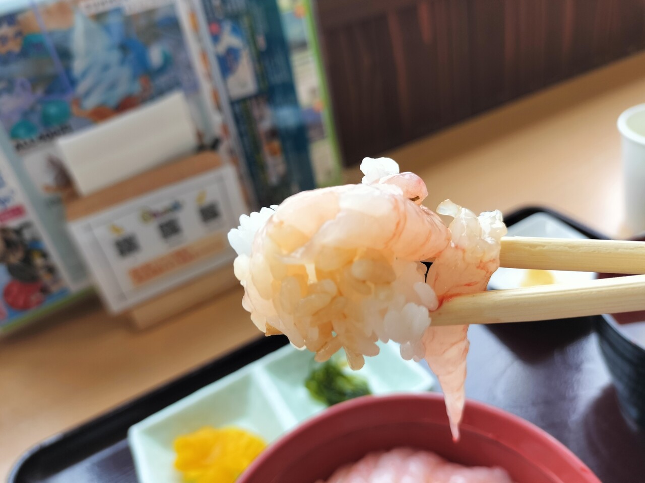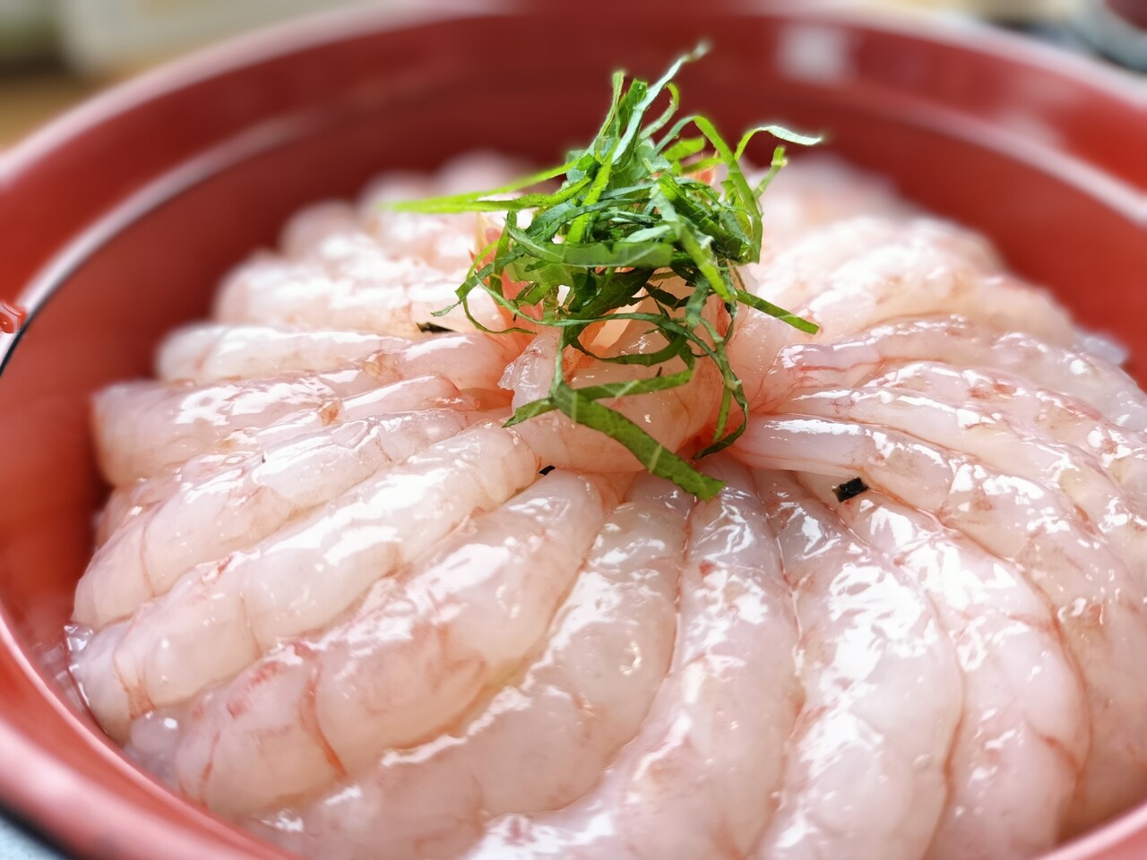 浜の母さん達の作業をみながら5〜6分ほど待っていると番号呼ばれたので甘えび丼を受け取って参りました