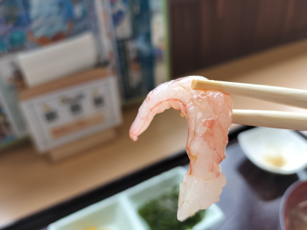 甘えびを掴むと 透明感のあり艶々したビジュアル…それをパクリと食べてみると… 甘い!
