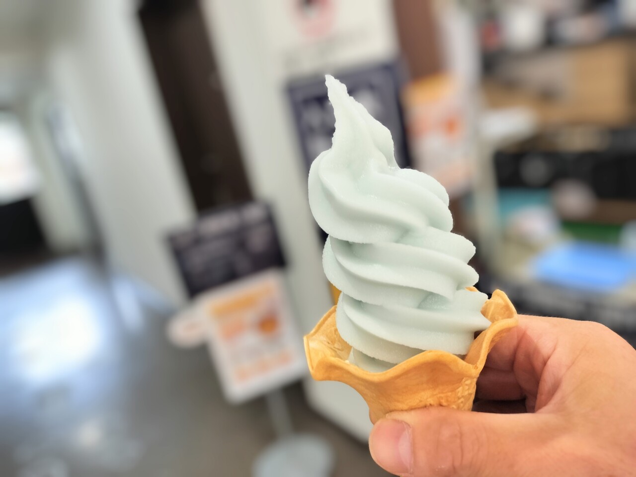 写真ほどは青くないけど 淡く青みがかったソフトクリーム