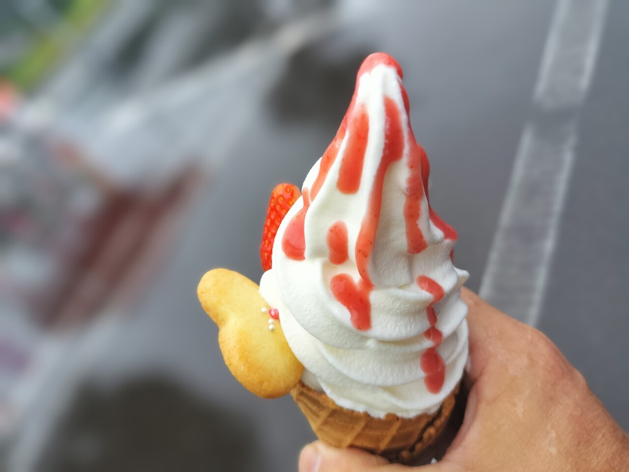 食べると口溶けの良いソフトクリームで濃厚だけれど後味サッパリ、それに甘酸っぱい苺ソースがバリバリ美味い!