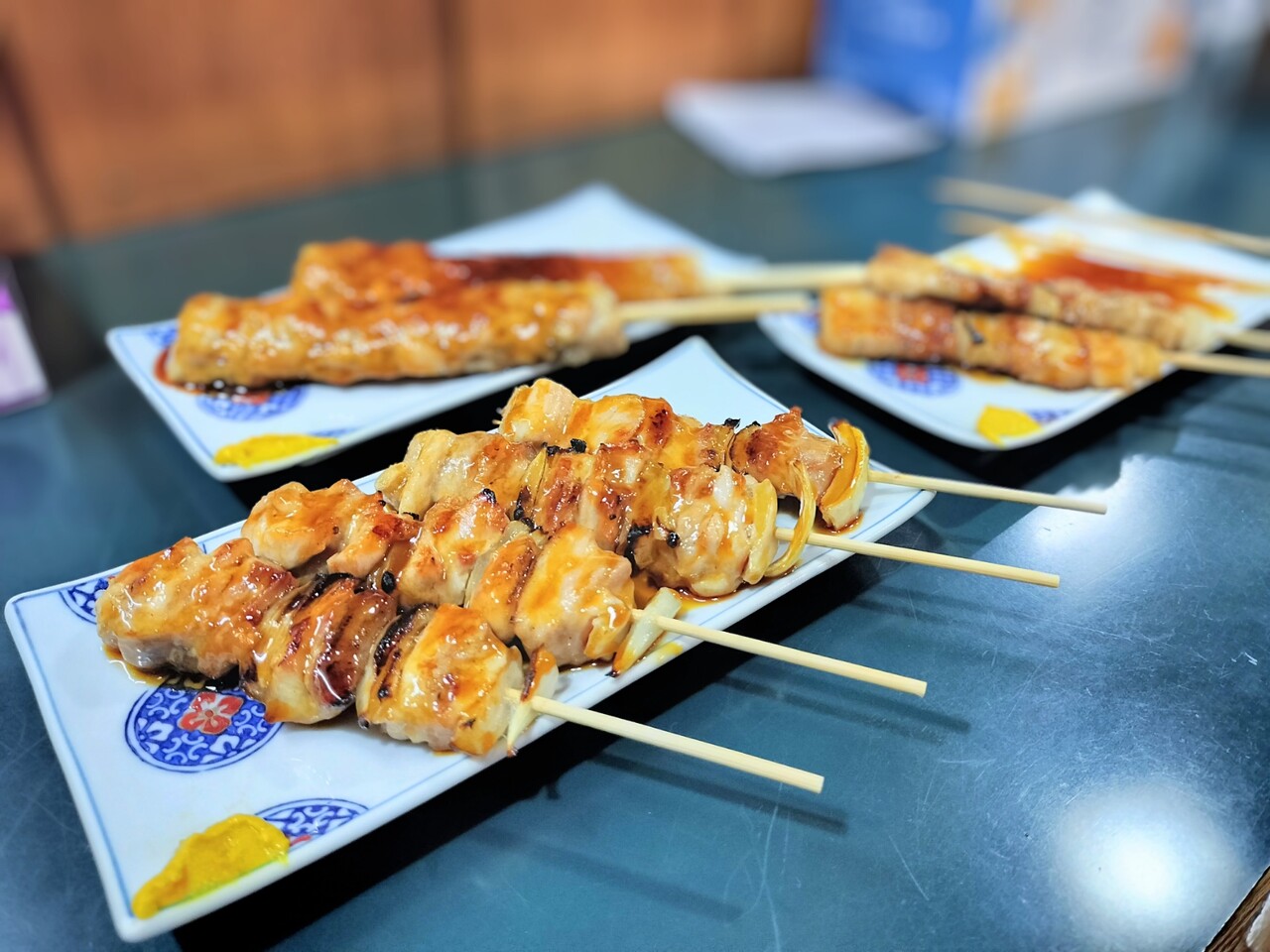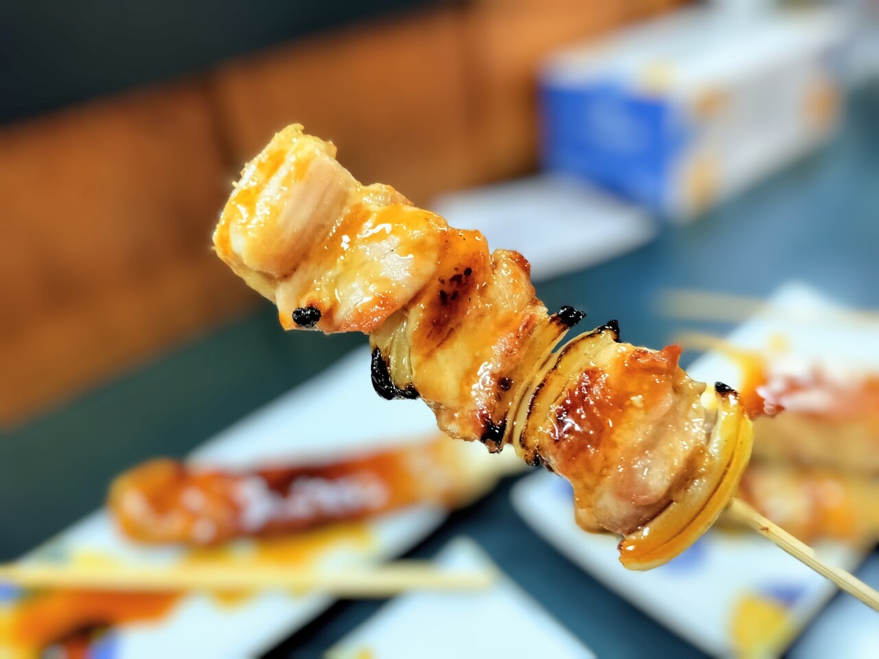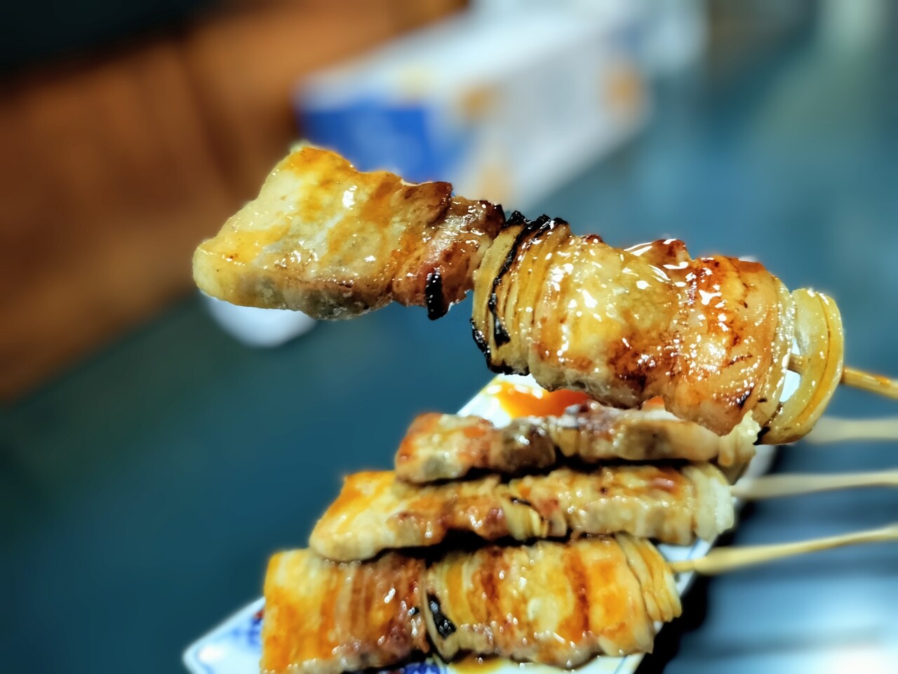 全て揃う前に1本だけ先に食べると 豚バラ肉が柔らかくて脂身も甘くて美味い!豚バラ肉の間には長ネギではなく玉ねぎがサンドされておりこれも甘くて美味いんだなぁ室蘭風?タレも甘めですが良い感じ