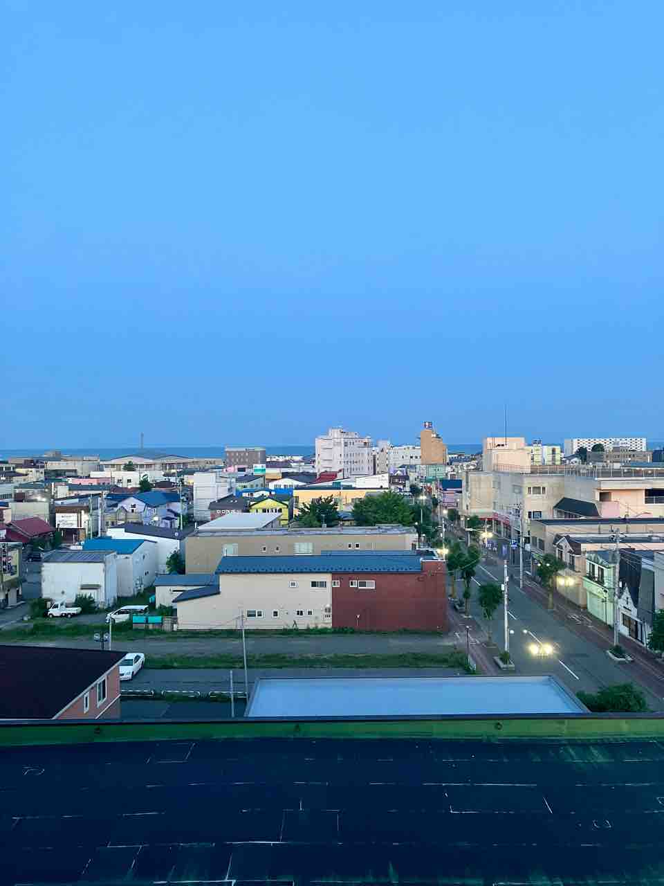 早朝目醒めカーテンを開くと部屋からの景観はこんな感じで 見知らぬ土地の街並みで平凡であっても何故か感慨深いものがありました。奥には海が見える部屋