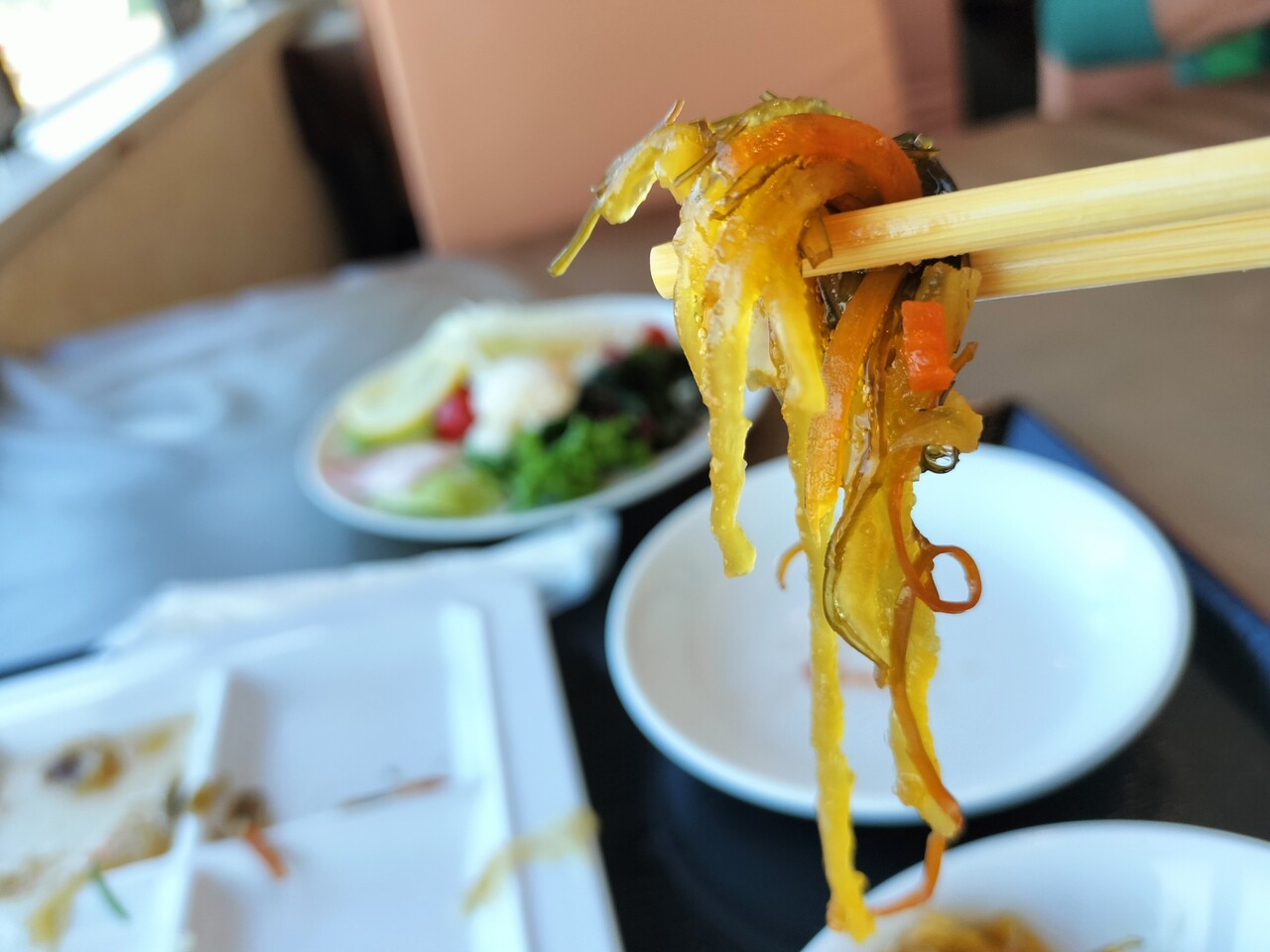 会場はこんな感じで 横に長い会場で数々の料理が並んでおりました。ちなみに窓の奥はオーシャンビューと街並みが見えます