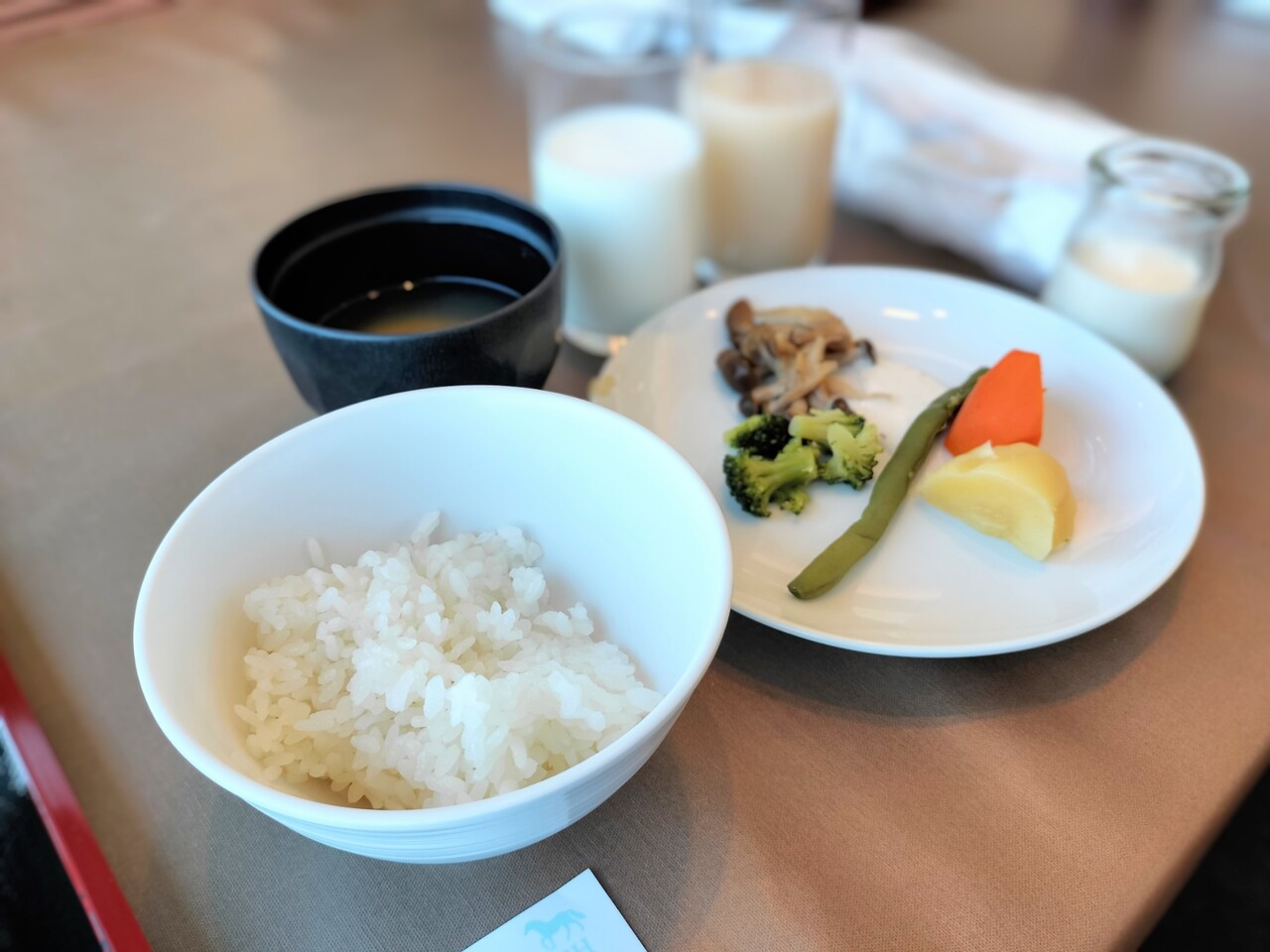 ご飯、味噌汁、ボイル野菜、牛乳にカツゲンも