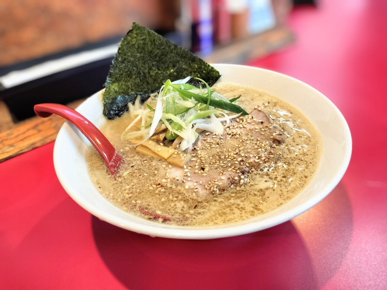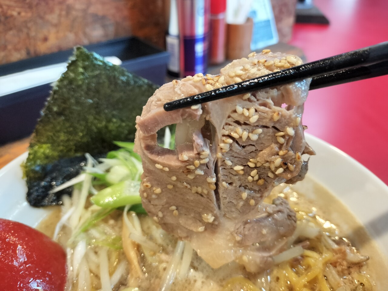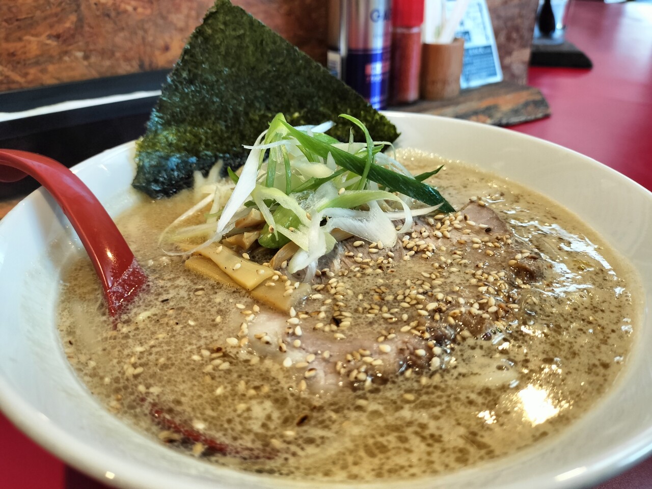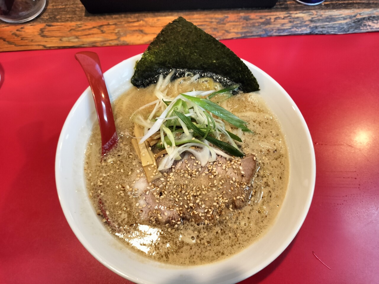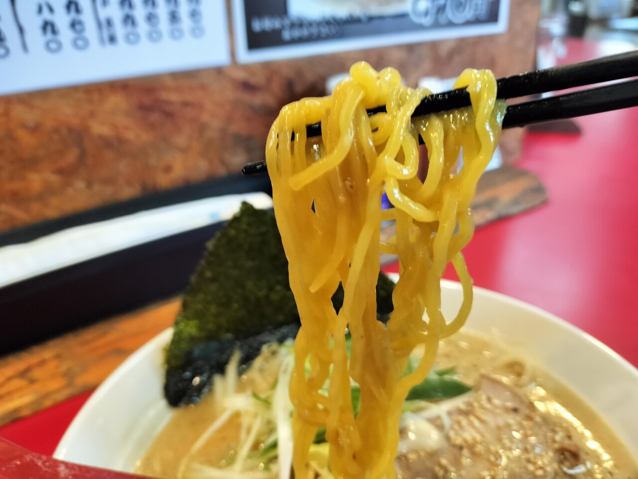 先ずはスープを頂くと 旨みとコク深いスープらそさてゴマの風味が良いアクセントでバリバリ美味い!