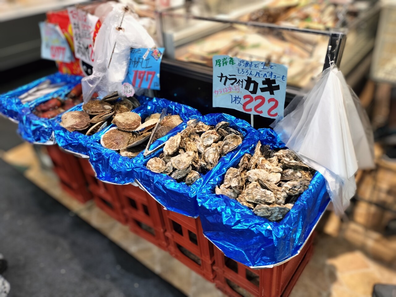 でも今回は持って帰れないので泣く泣く諦め鮮魚コーナーへ向かうと牡蠣、帆立、ホヤ等が販売されており