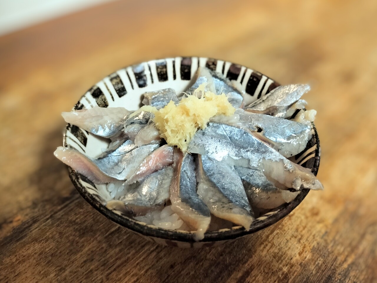 そして今回の買い物の本命である 生秋刀魚、刺身を切って秋刀魚丼を盛り生姜を添える…(映え感無視)