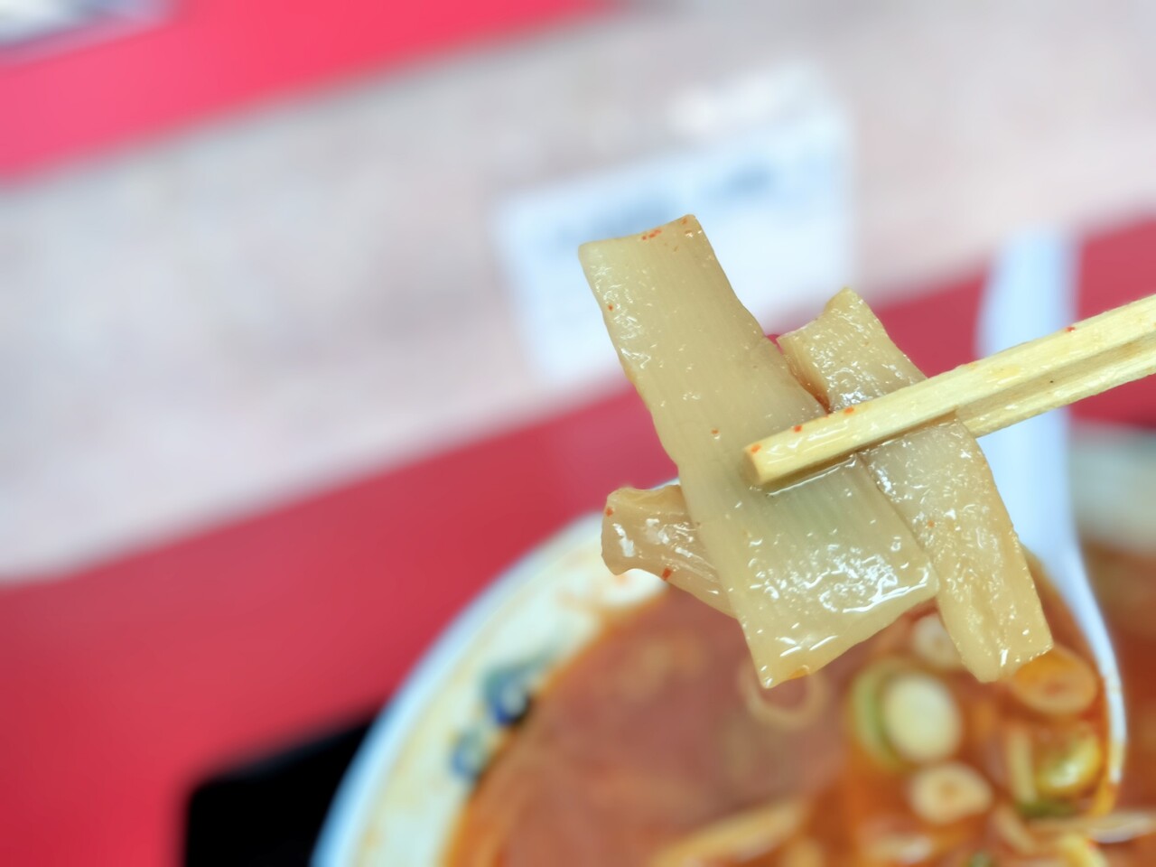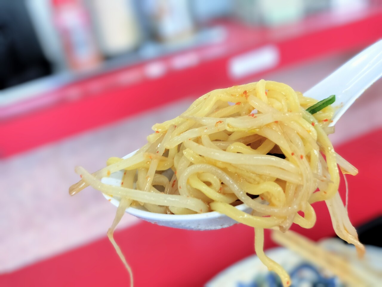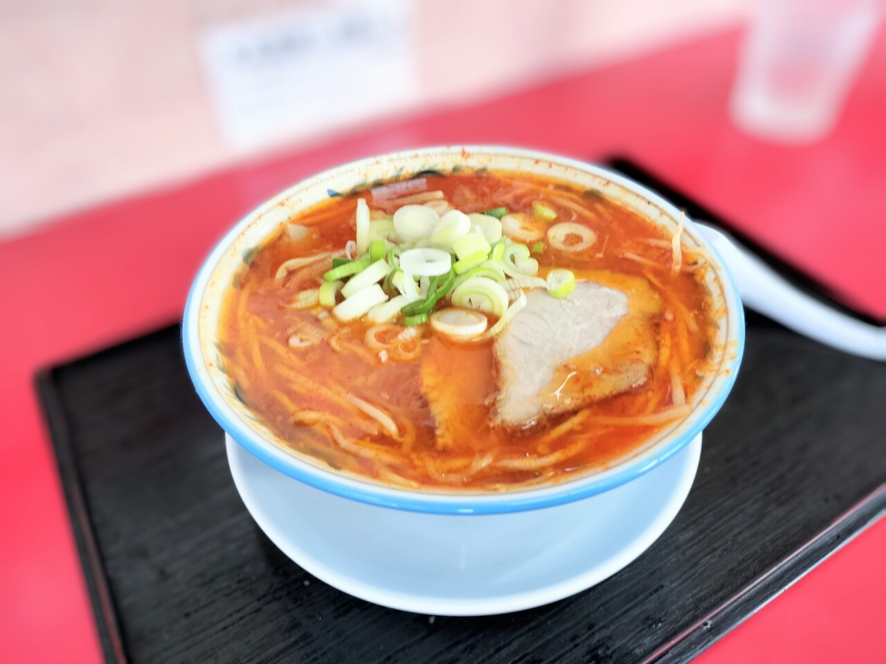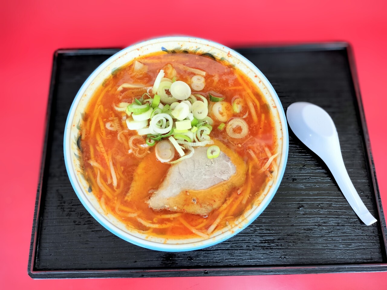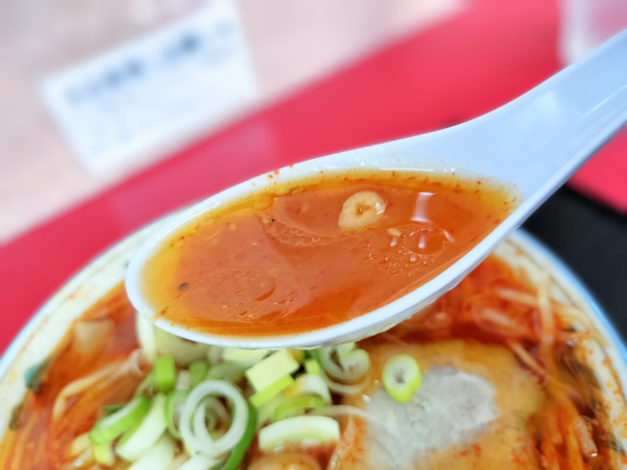 辛そうなスープの色味、そして表面をラードで覆われておりいつもの東光亭(具材 メンマ、もやし、チャーシュー、長ネギ)