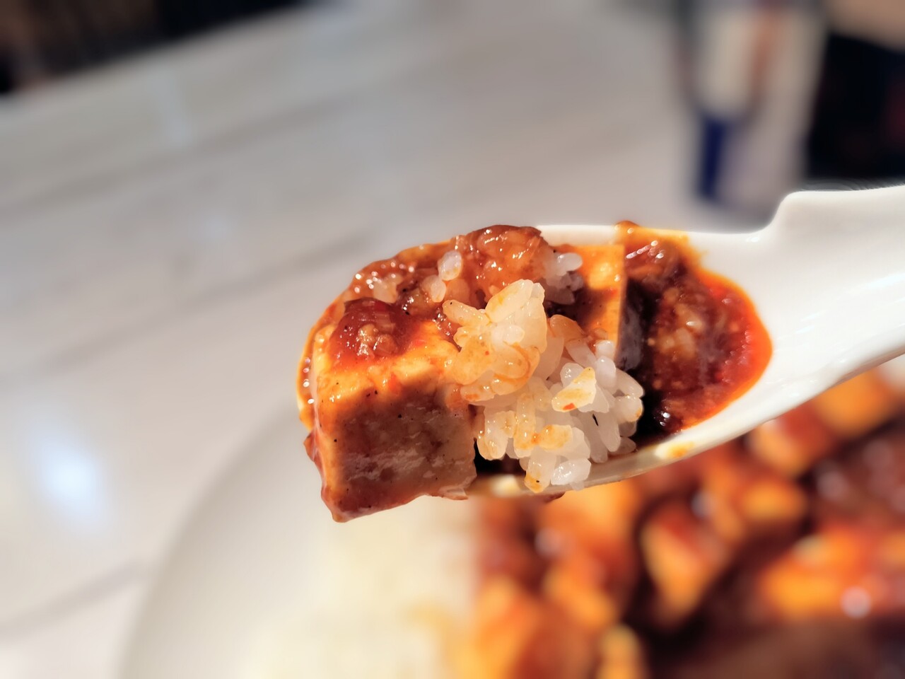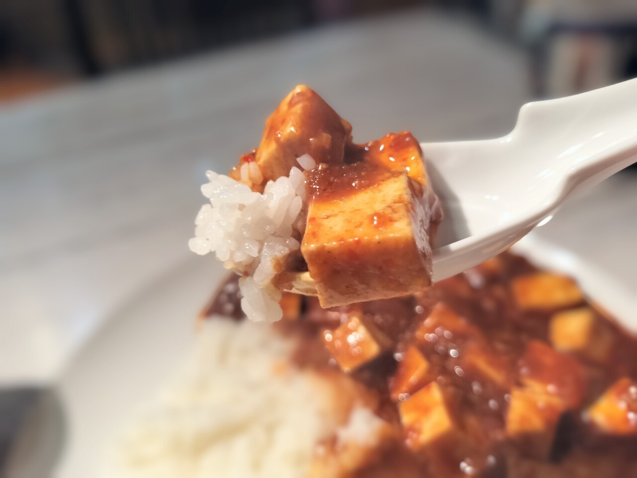 先ずはマーボー豆腐を一口食べると… 最初は甘辛い味わいですが(辛さはそんなにない)後から舌がピリピリする痺れがやってきて美味い!