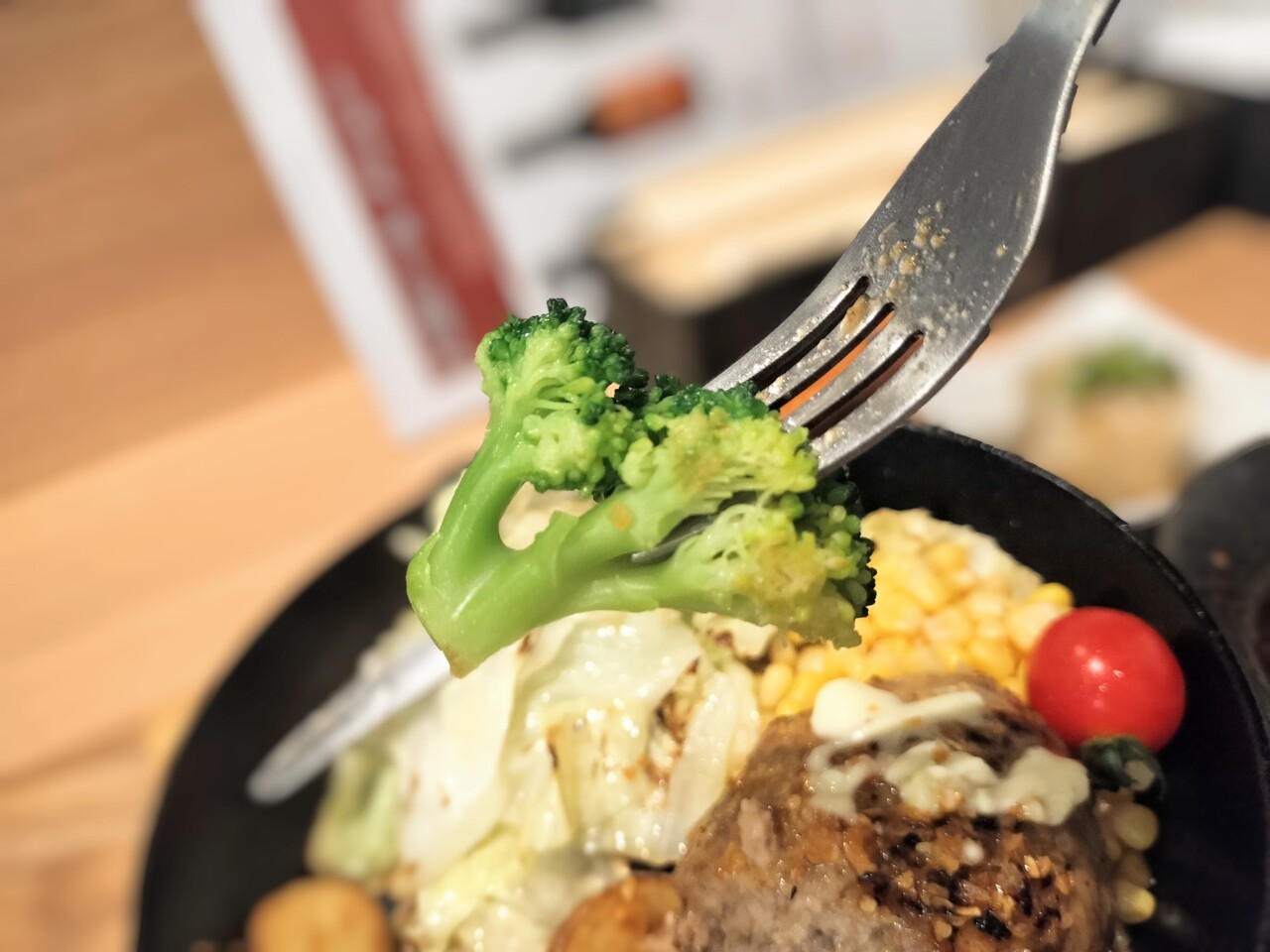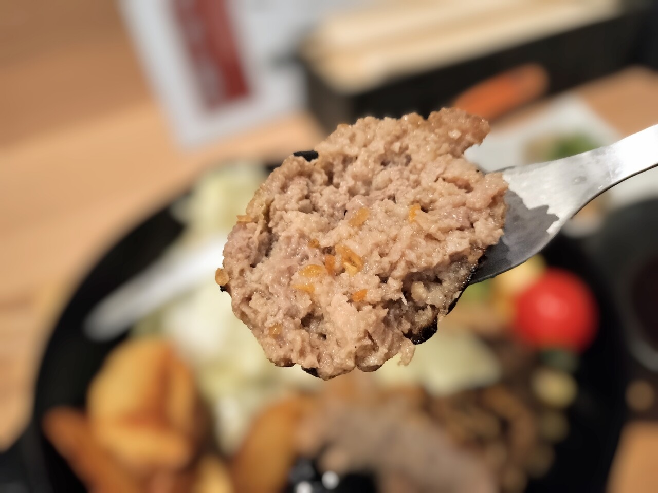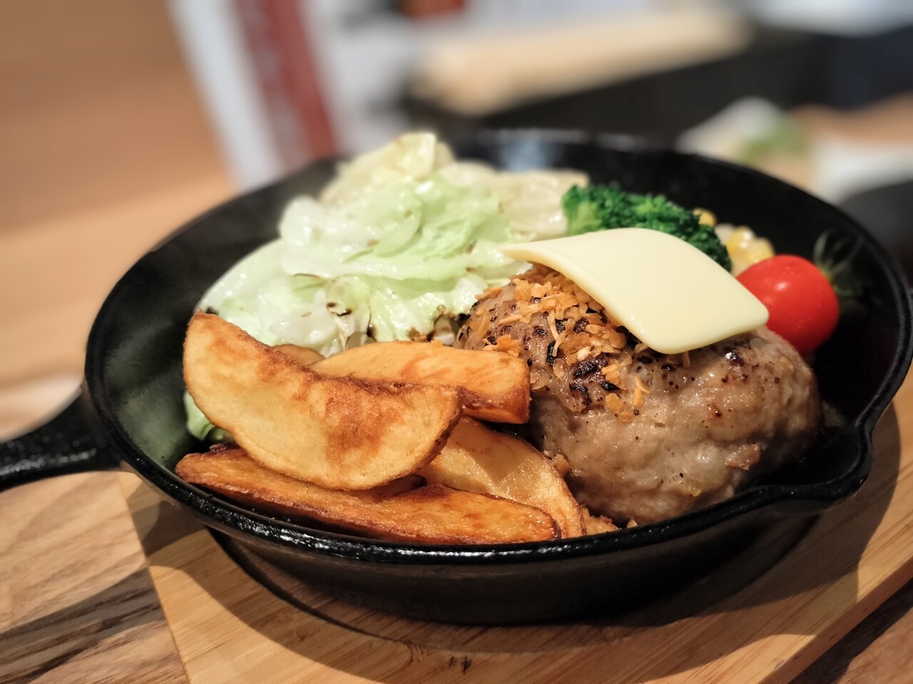 ぐつぐつと音を立てて運ばれてきたハンバーグ、フライドポテト、キャベツ、ブロッコリー、ミニトマト、コーン