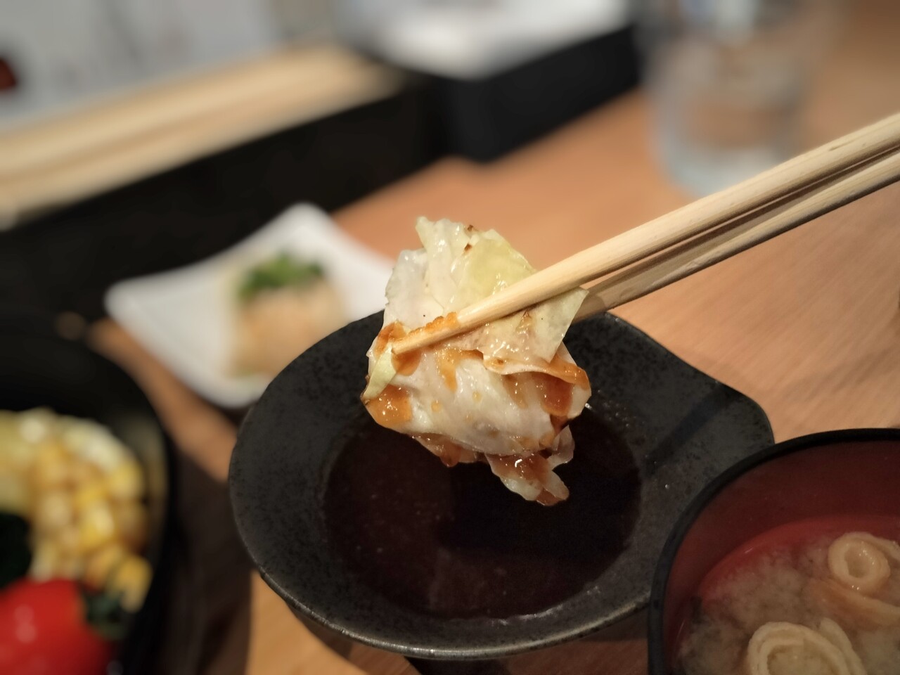 和風ソースにディップして食べると和風ソースの塩っぱさとキャベツと甘みが良い感じ。にしてもキャベツの利用が多いな…