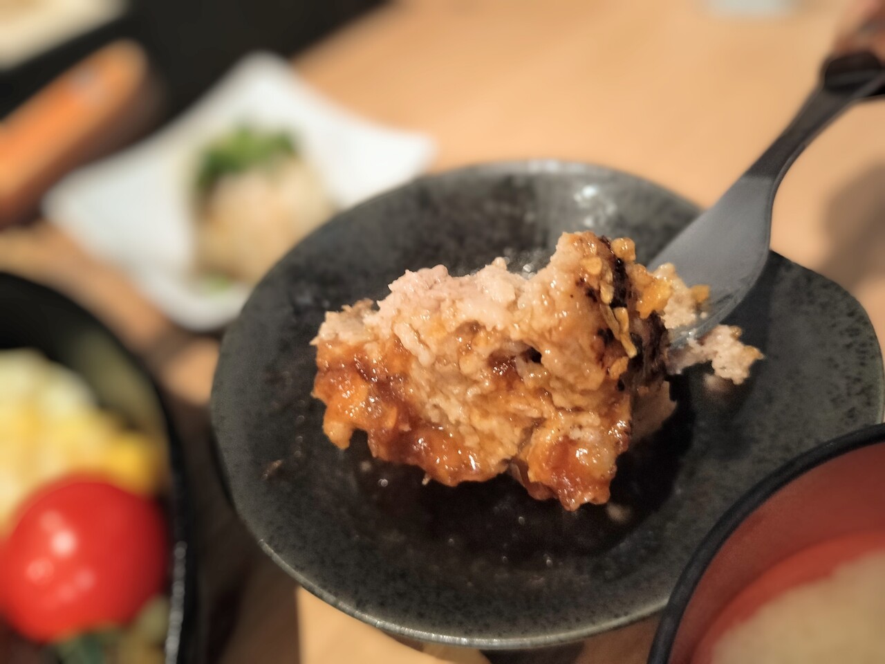 和風ソースをディップして食べると肉肉しいハンバーグで味濃い和風ソースが脂と相まって美味い!