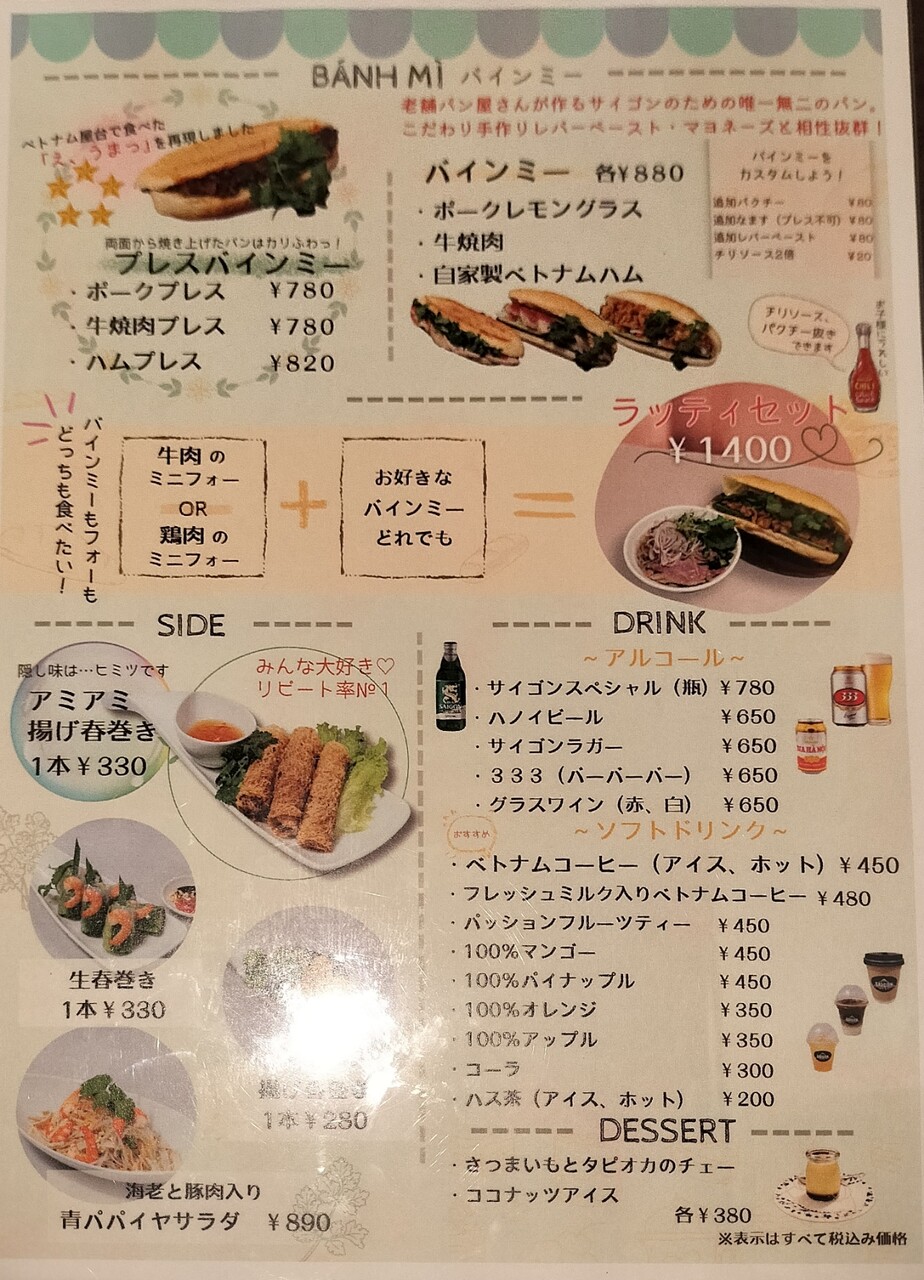 入店するとまず耳にはBGMはベトナムミュージック、そして内装は東南アジアを感じるテイストでした。テーブル席に通されてメニュー表を眺めます