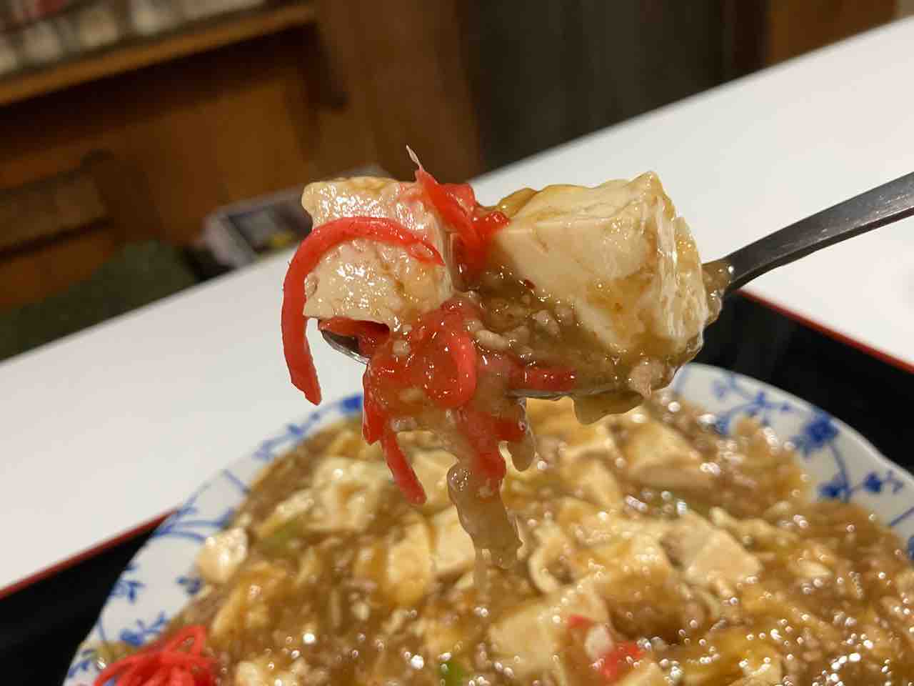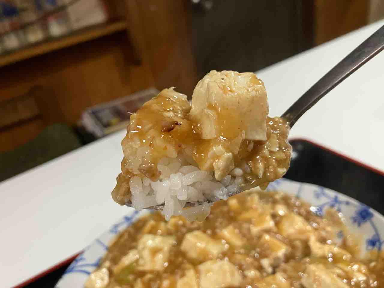 早速スプーンで麻婆豆腐を頂くと ぷるんとした豆腐の食感と甘い麻婆豆腐で美味い!そして後から仄かに辛みがやってきます