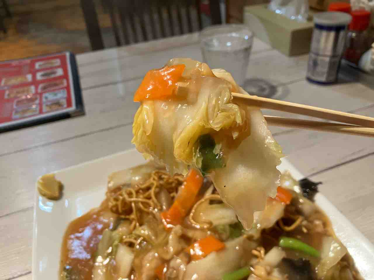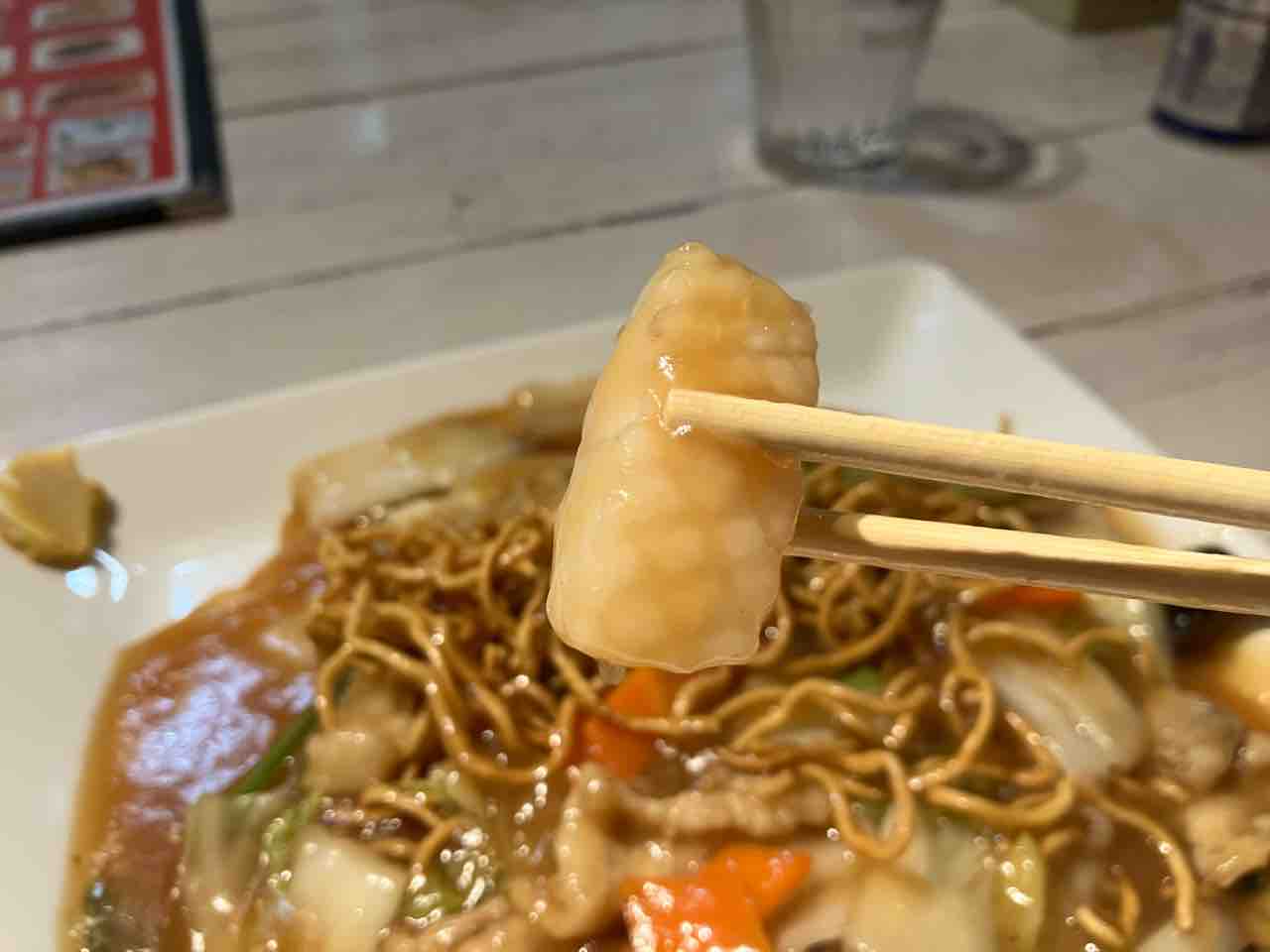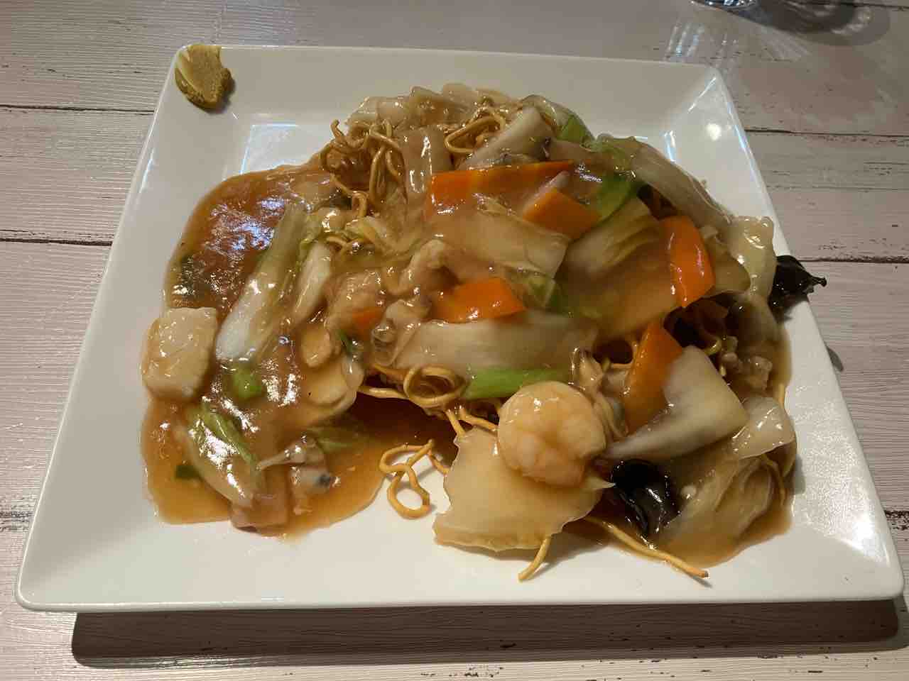 揚げ焼きそばの上には沢山の具材(白菜、椎茸、人参、木耳、青梗菜、イカ、エビ、しじみ、豚肉 他)の五目あんが乗っかっておりすでに美味しそう