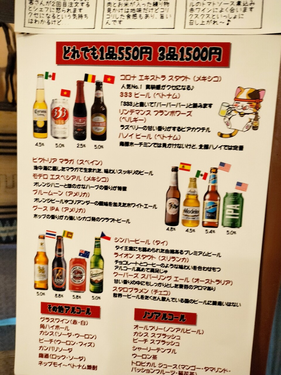 メニュー表を眺めます。どれでも1品¥550 3品で¥1,500のわかりやすい料金体系なのも良い